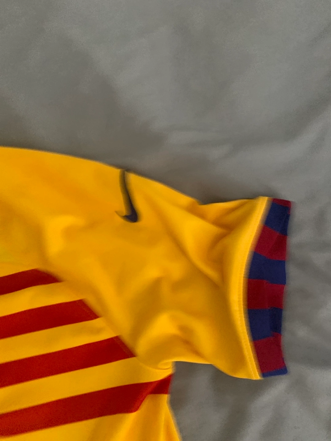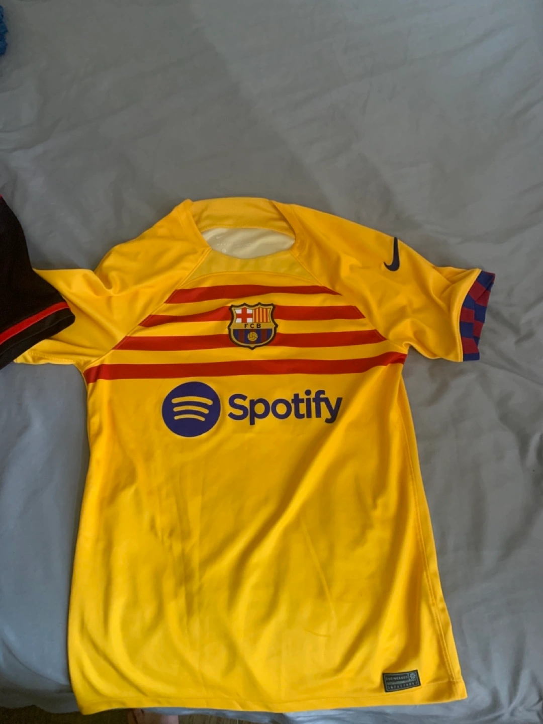 FC Barcelona away jersey. Yellow with red and maroon stripes. Spotify sponsor logo. UNHCR logo on the back. Nike Dri-FIT technology. Size small.
