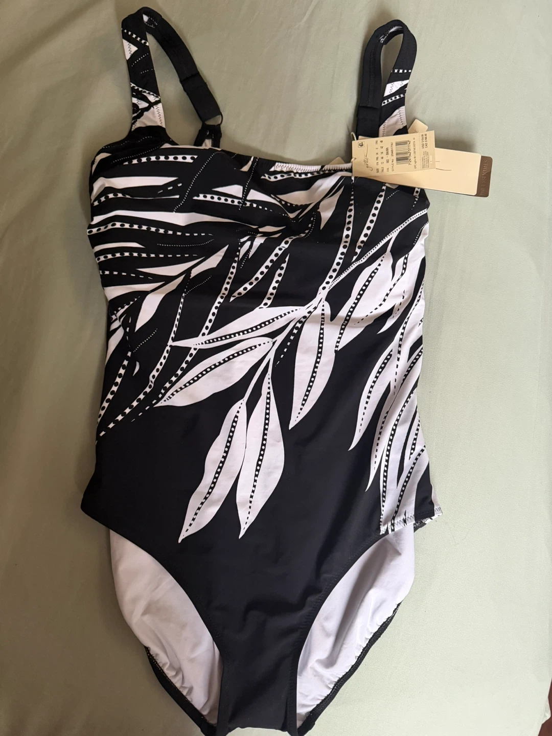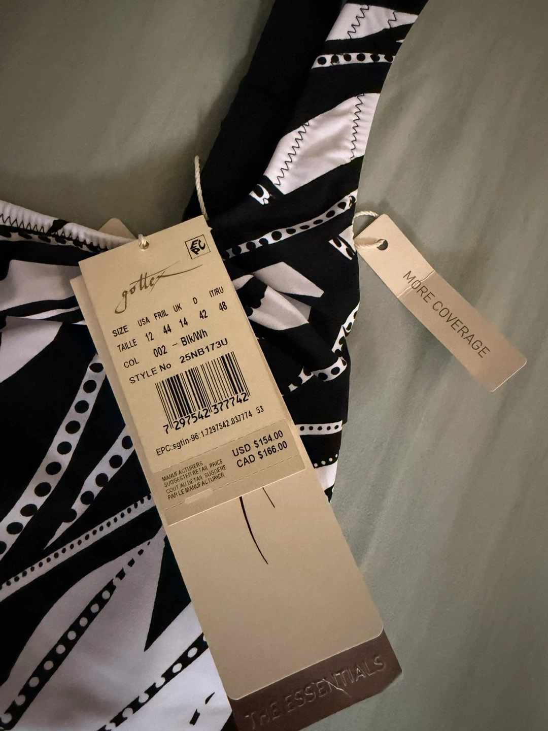 Gottex one-piece swimsuit in a black and white leafy print. It's size 12 and features "more coverage". Perfect for a stylish beach day!