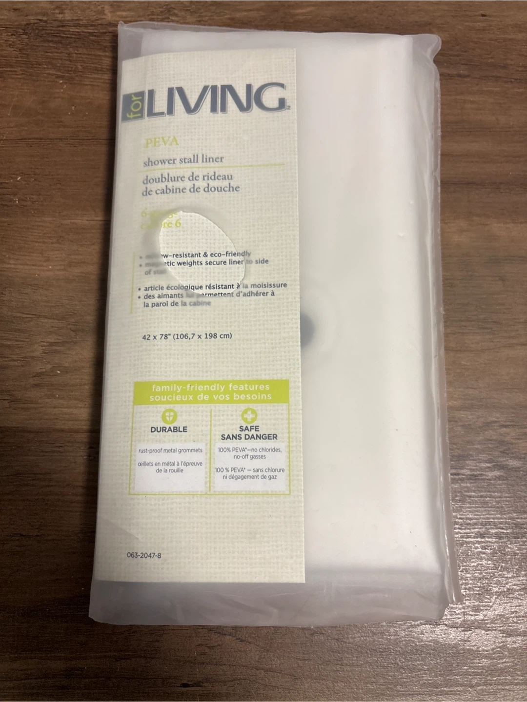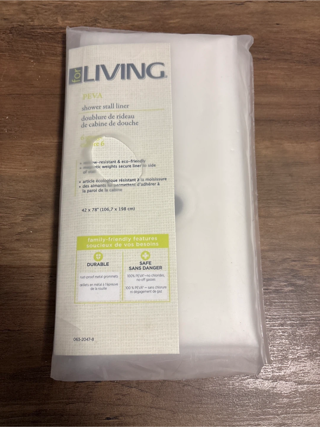 Selling a brand new for LIVING PEVA shower stall liner! It's still in its original packaging. The size is 42 x 78 inches (106.7 x 198 cm). It's mildew-resistant and eco-friendly, with magnetic weights to secure the liner to the side of the tub. It's also durable with rust-proof metal grommets and is safe, made of 100% PEVA, with no chlorides and no off-gasses