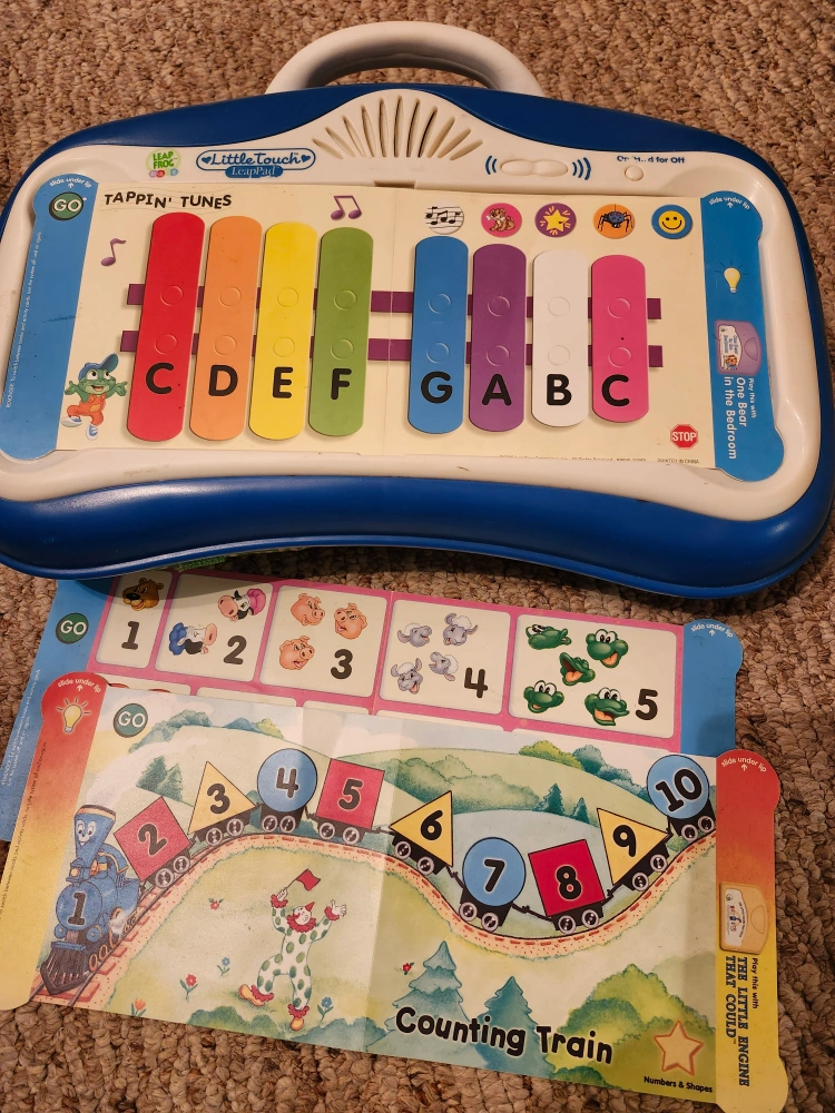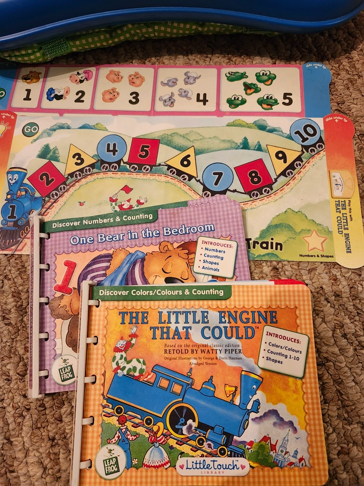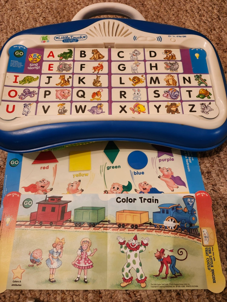 Pre-owned LeapFrog LittleTouch LeapPad learning toy. Includes interactive books and activity cards. Features include alphabet, numbers, colours, and shapes. Excellent for early childhood learning. pick up Castledowns, can meet /deliver Northgate, Londonderry, Skyview.