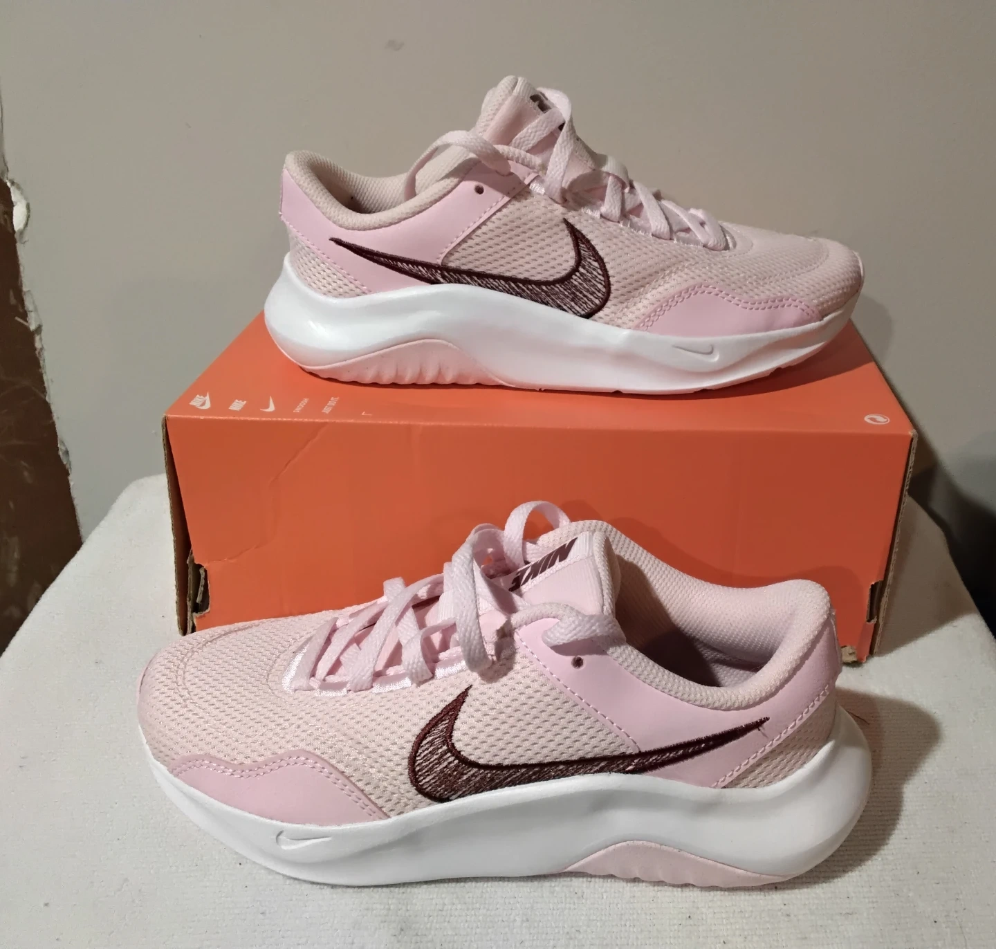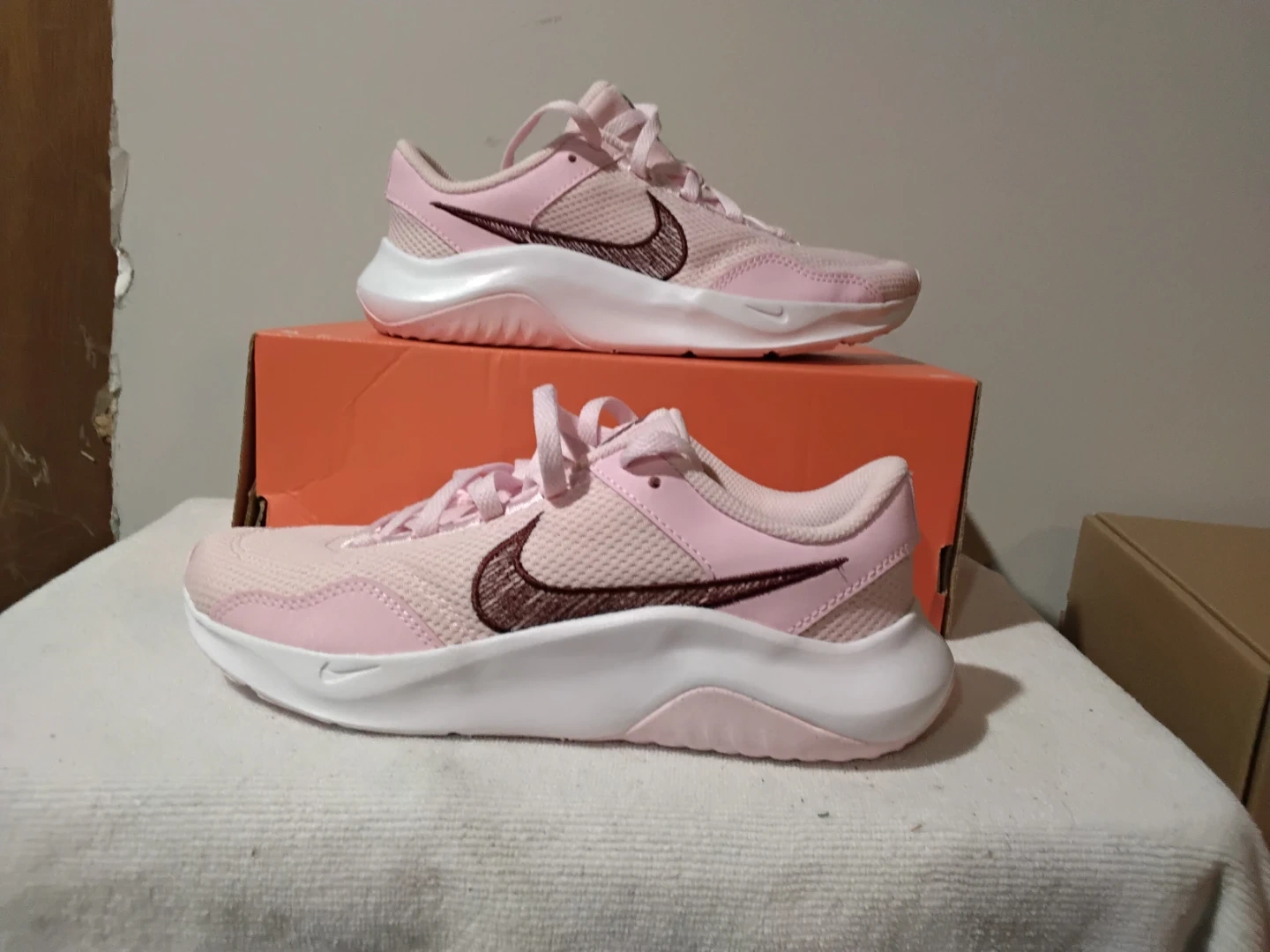 These Nike running shoes are a light pink color with a white sole. They feature the classic Nike swoosh. Perfect for your next workout or casual wear!