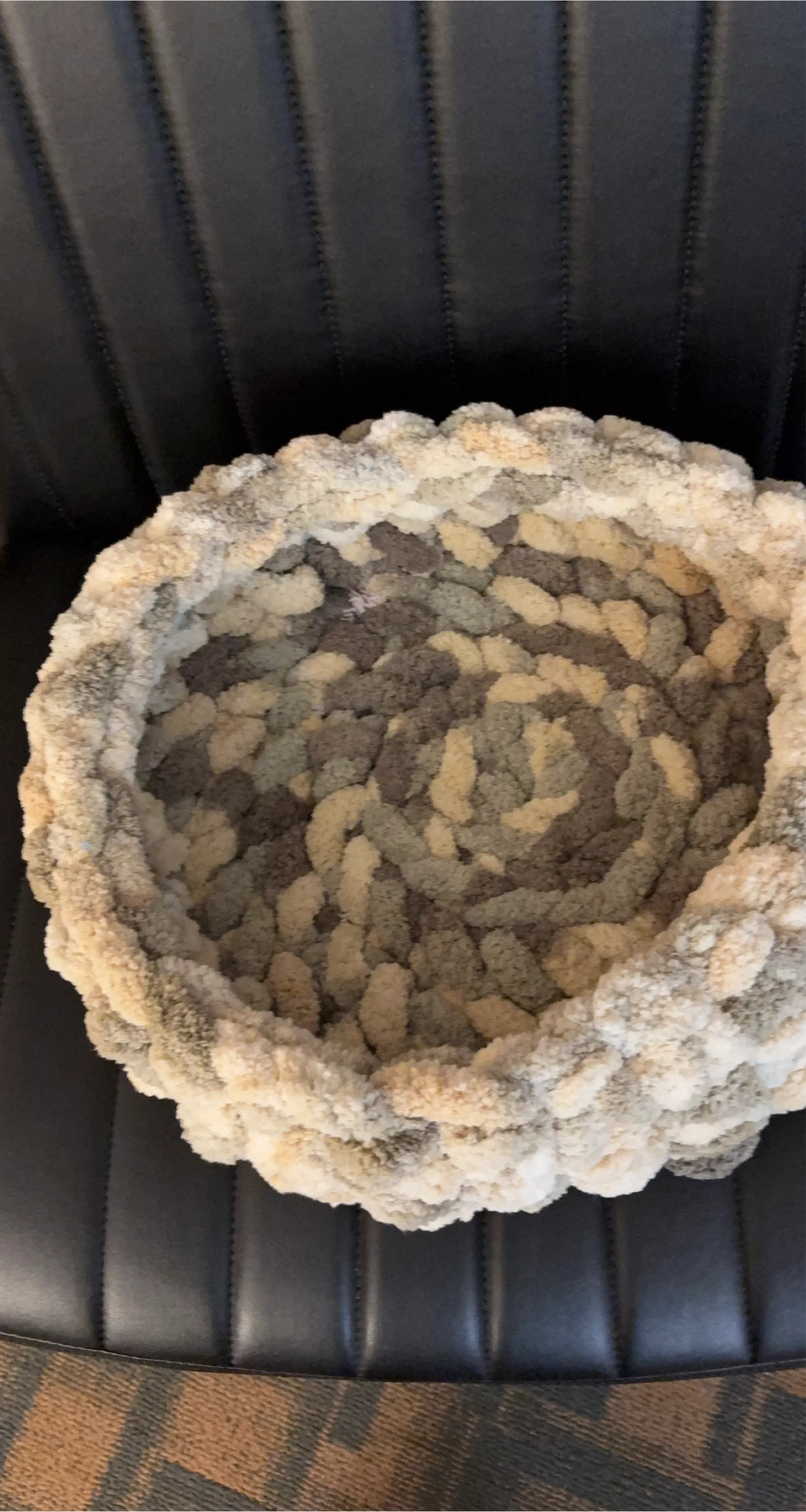 Cozy, handmade chunky knit pet bed with a camouflage pattern. Made from soft, plush yarn. It's round and has raised sides for extra comfort. Great for small to medium pets!