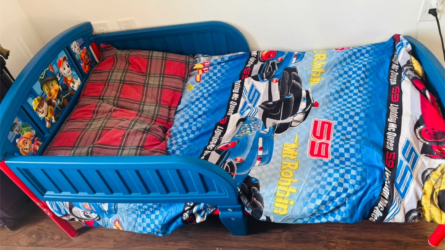 Toddler bed with Paw Patrol and Cars themed bedding. The bed frame is blue and features Paw Patrol characters.