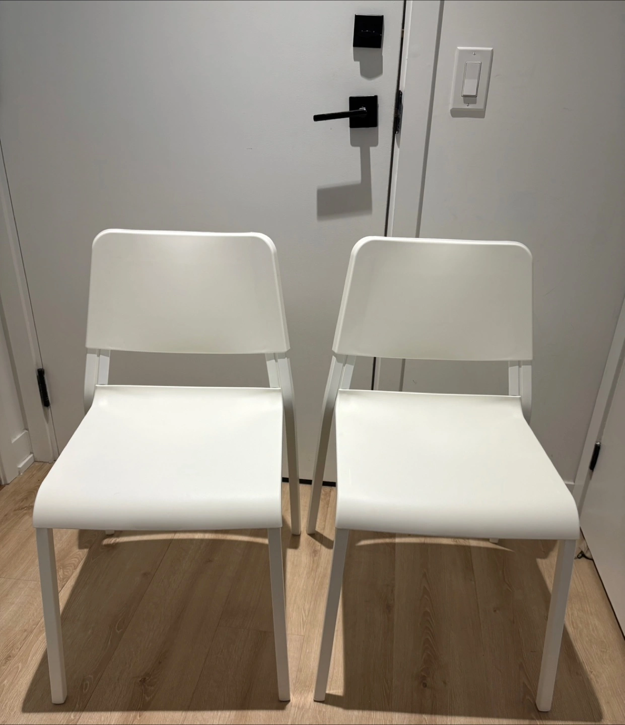 Two white plastic chairs. Simple design, lightweight and easy to move. Great for kitchen or dining room.