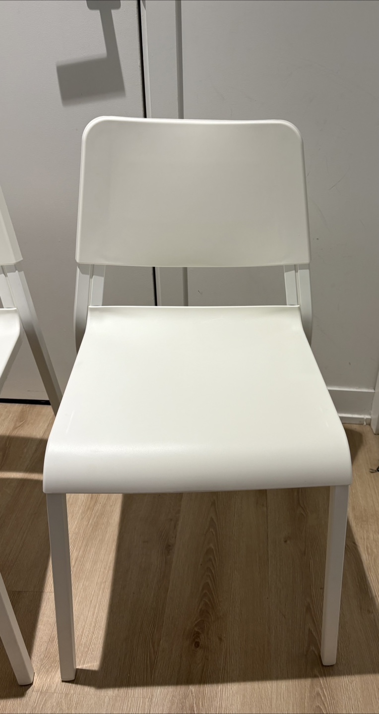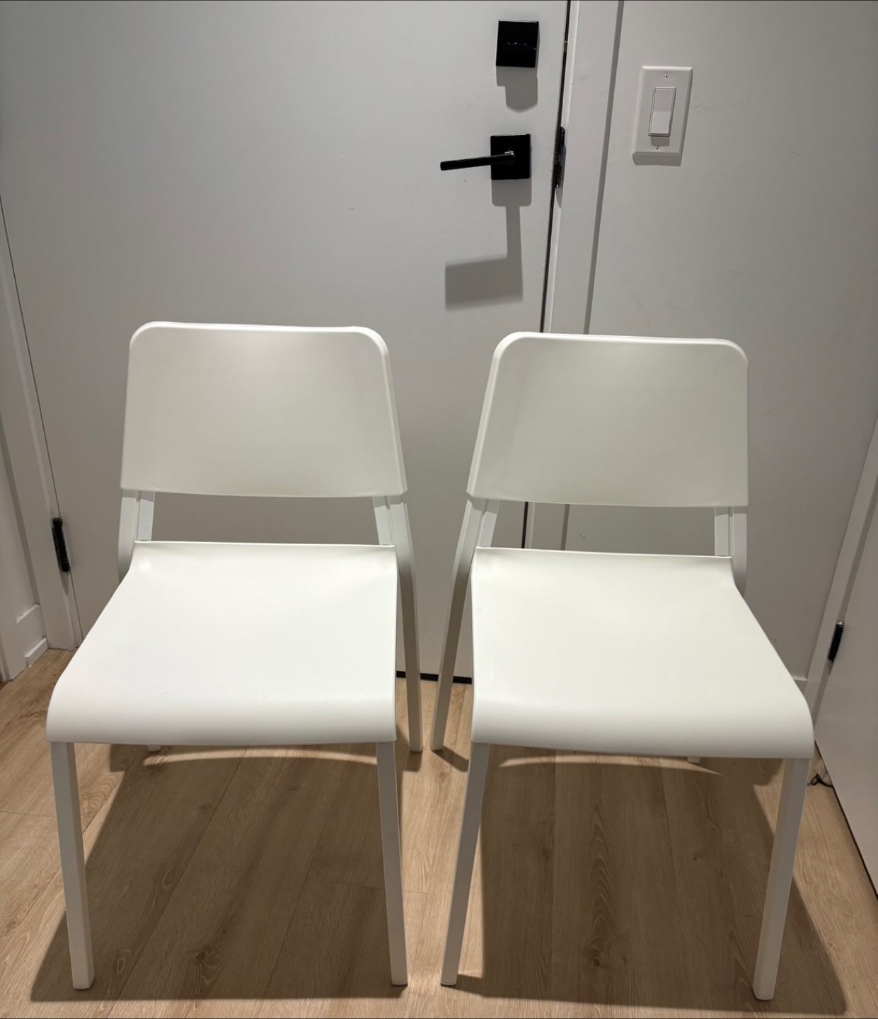Two white plastic chairs. Simple design, lightweight and easy to move. Great for kitchen or dining room.