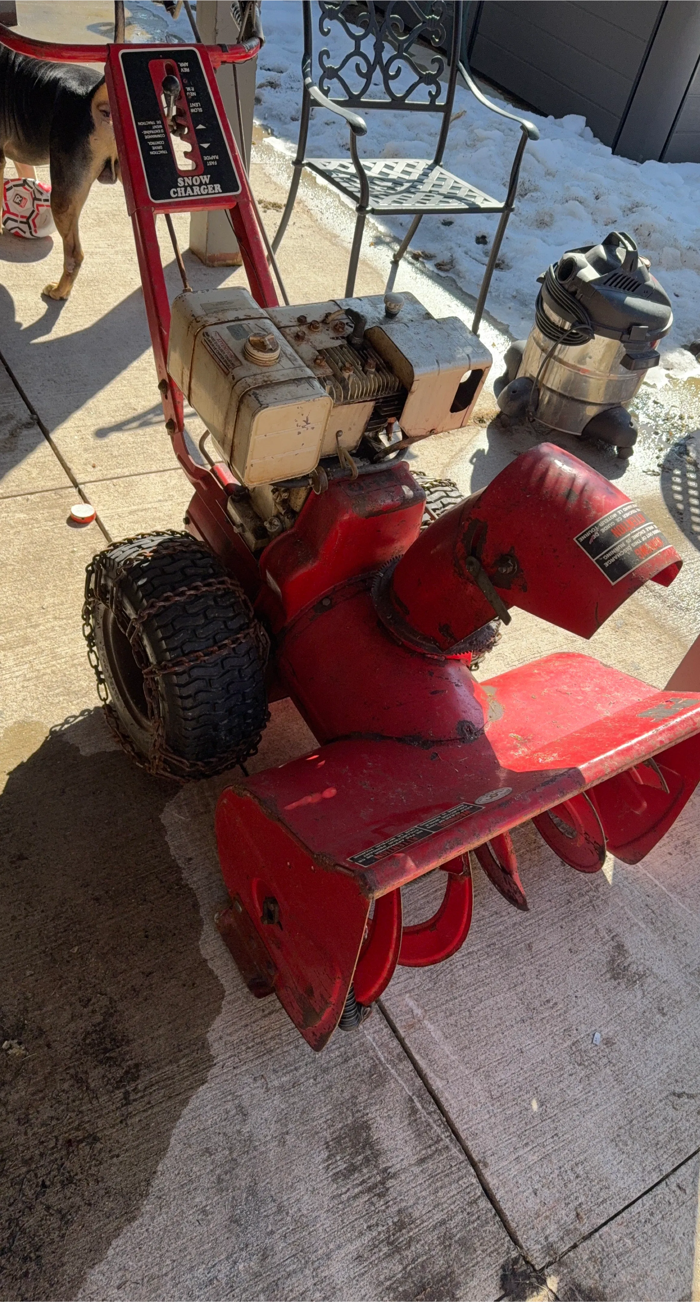 This is a red Toro Snow Charger snowblower with tire chains. It features multiple traction control settings including fast and slow speeds, and reverse. A robust machine built for clearing snow effectively.