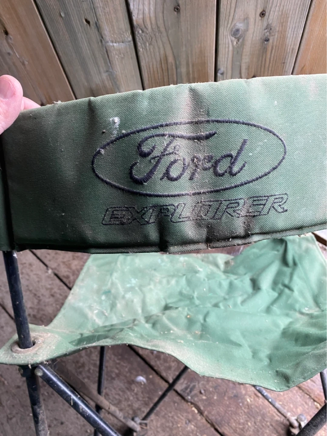 Pair of green Ford Explorer camp chairs. Durable canvas seat and back with metal frame. Collapsible design for easy transport.