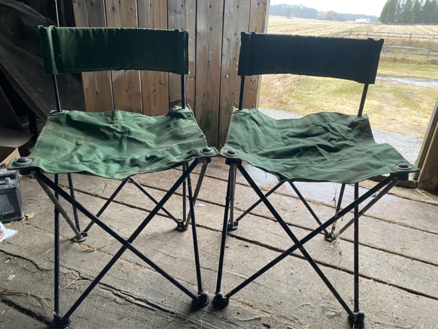 Pair of green Ford Explorer camp chairs. Durable canvas seat and back with metal frame. Collapsible design for easy transport.