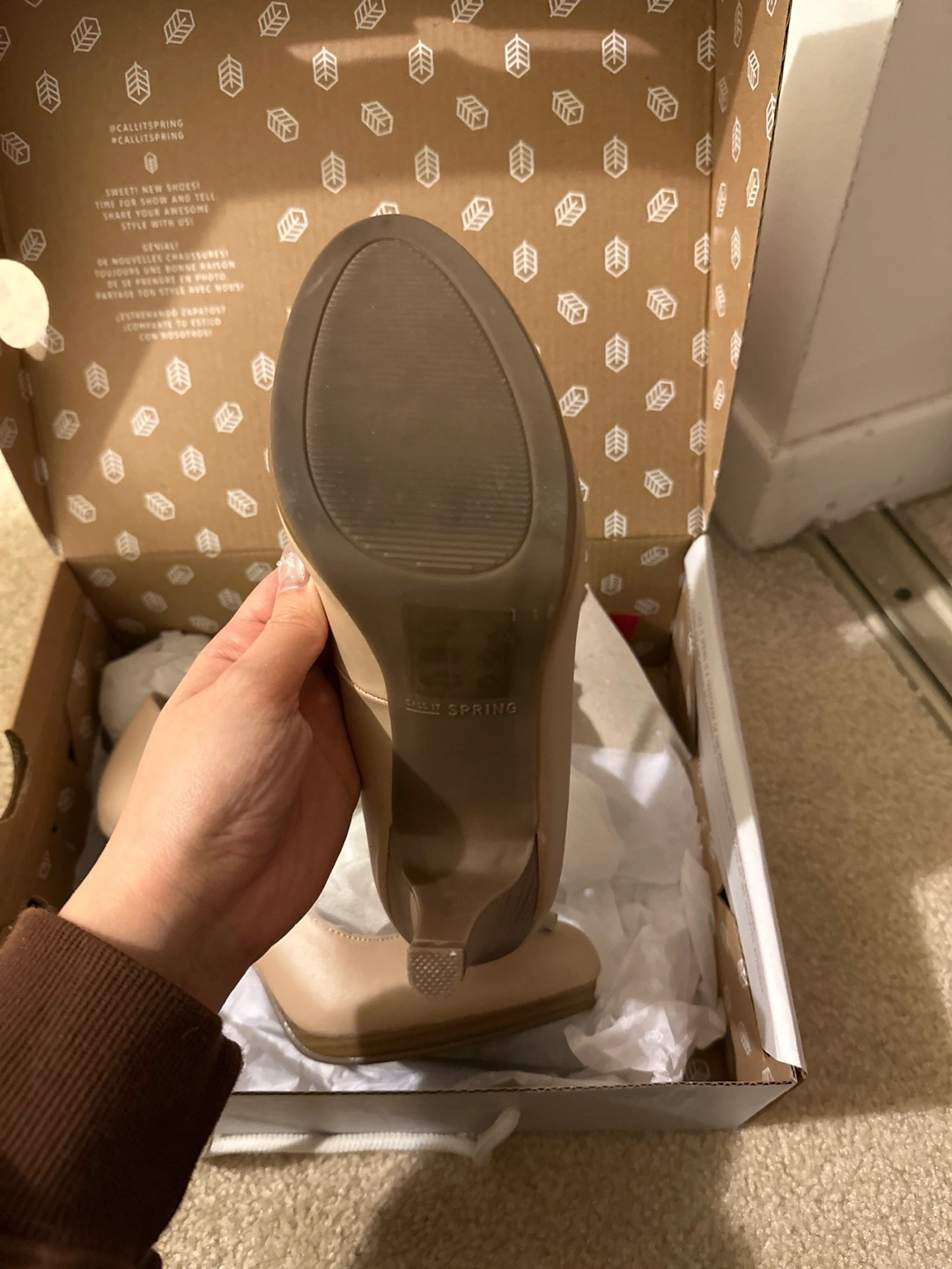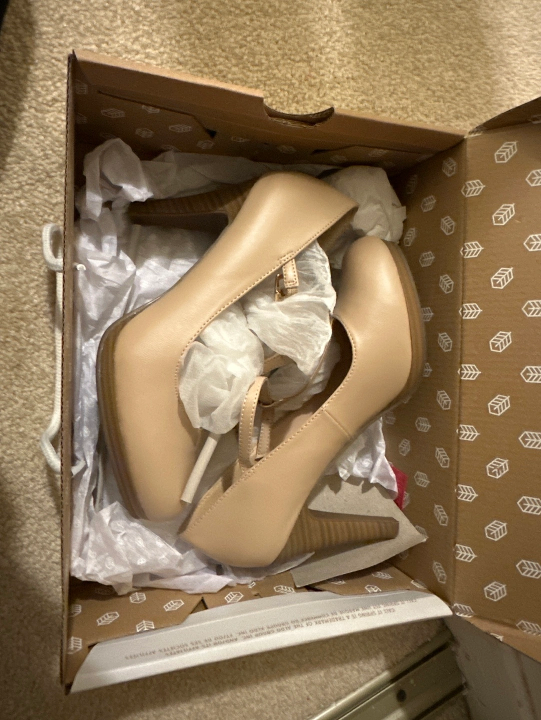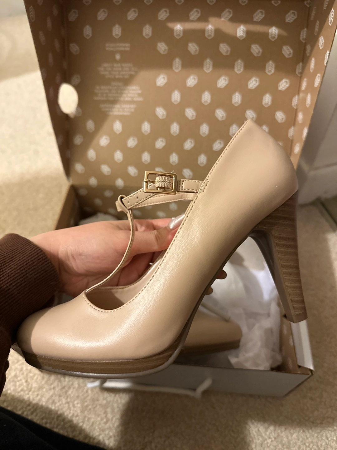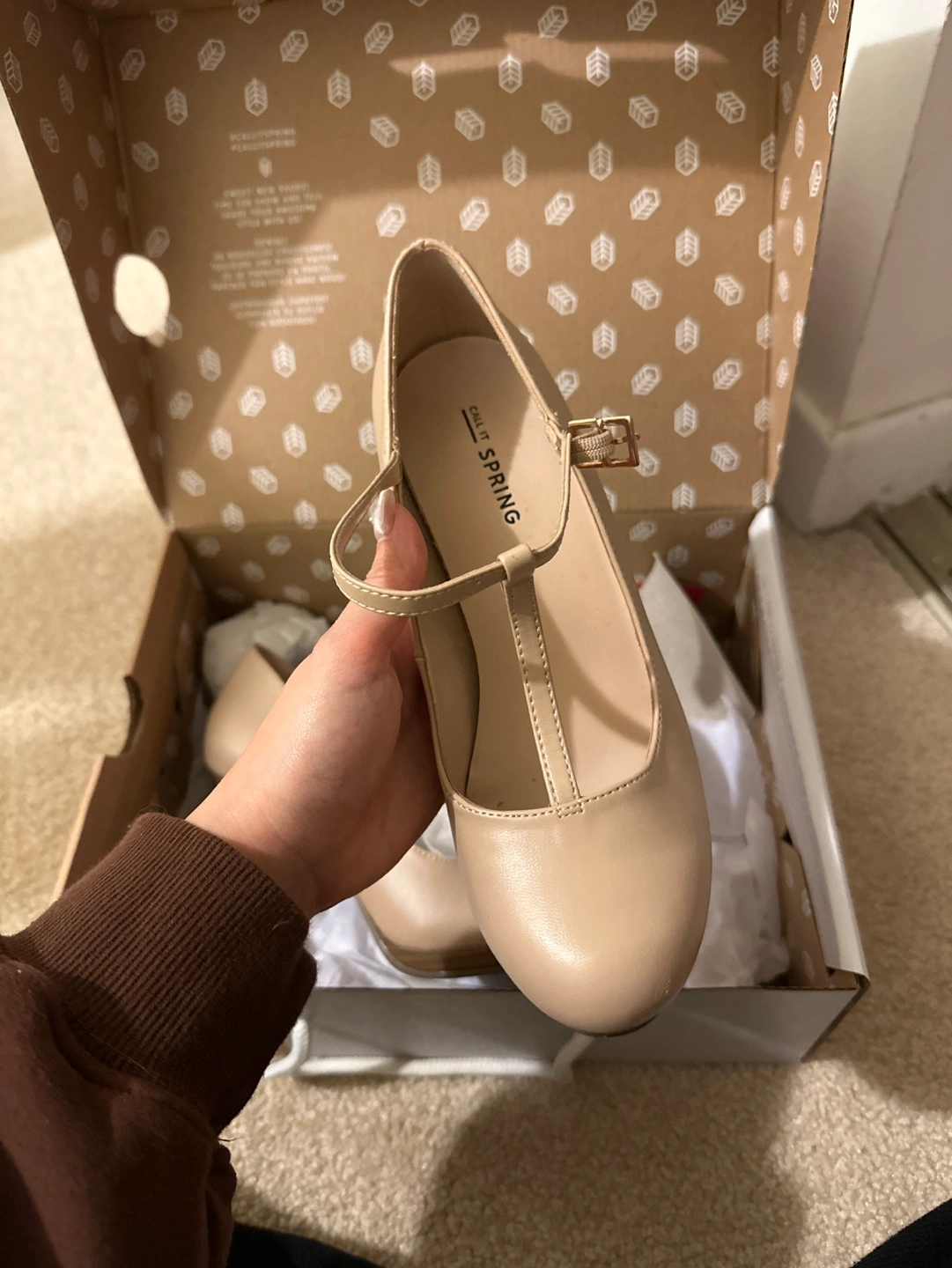 New Call It Spring women's heels. Beige colour. T-strap design. Wooden-look heel. Size not specified.