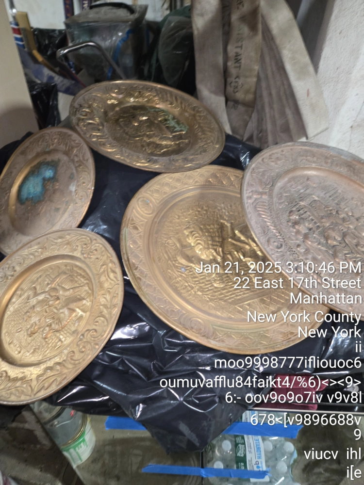 Four ornate brass plates. Intricate designs. Vintage or antique style. Great for collectors or home decor.