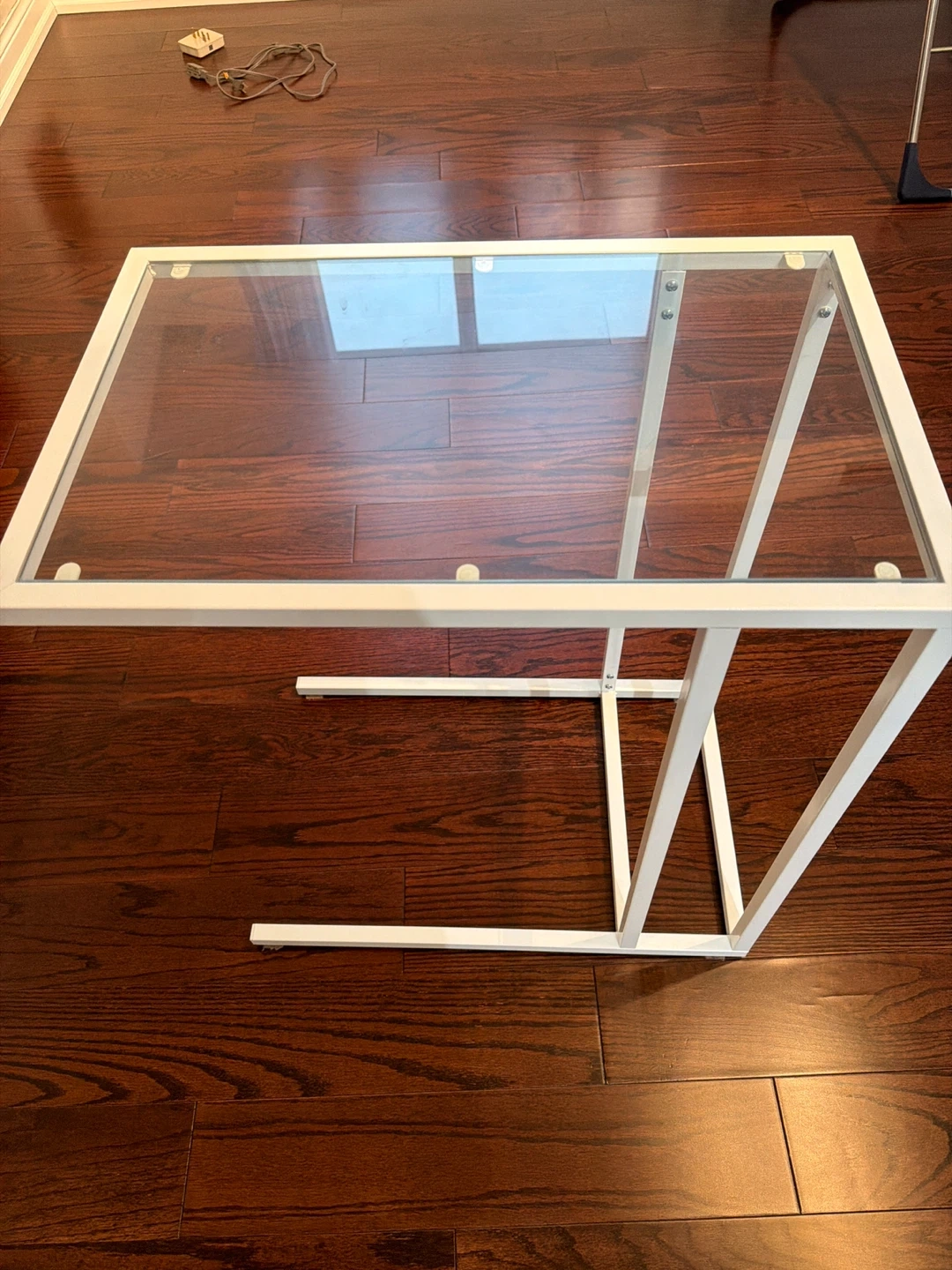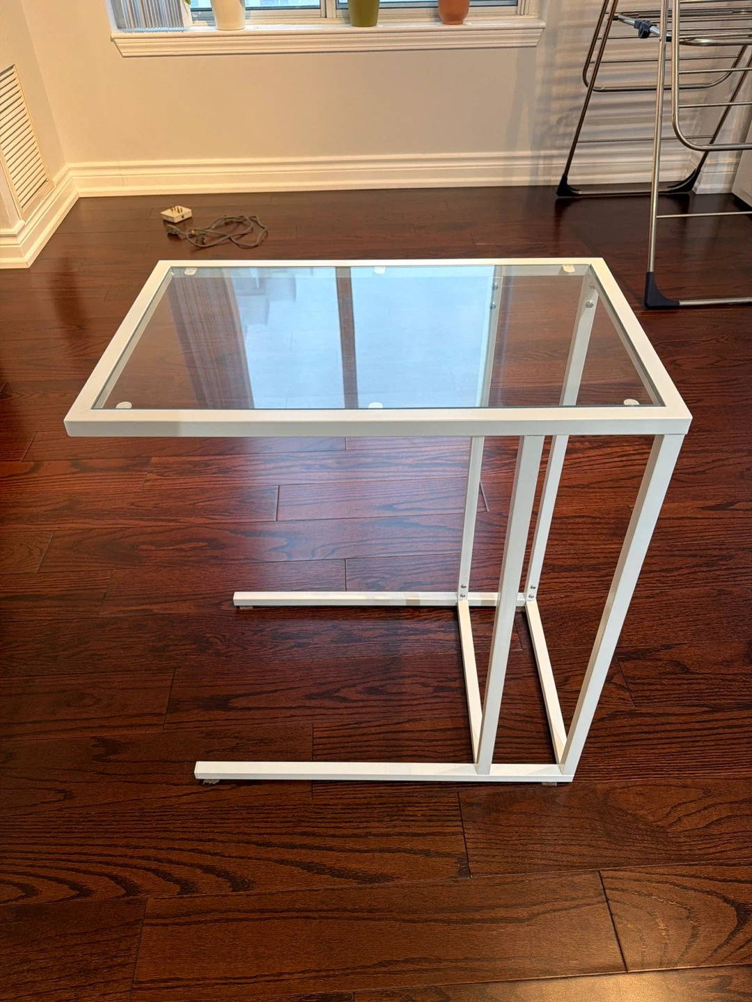 Selling a modern white side table with a glass top. It's in great condition and would look lovely in any living room or bedroom. The clean lines and simple design make it a versatile piece for any decor style