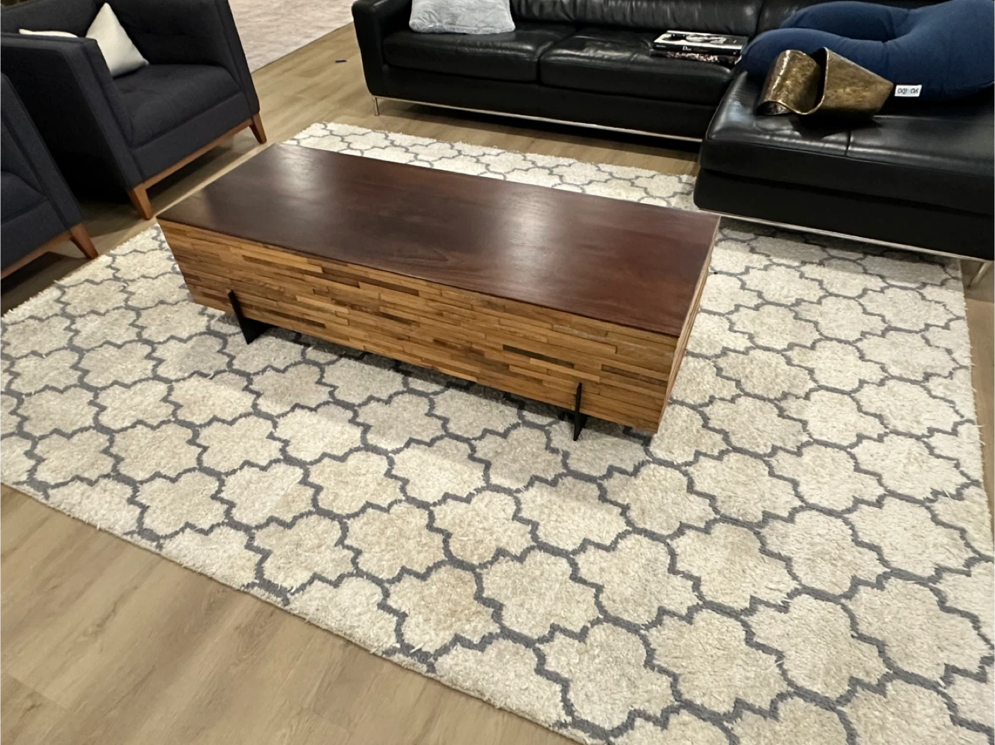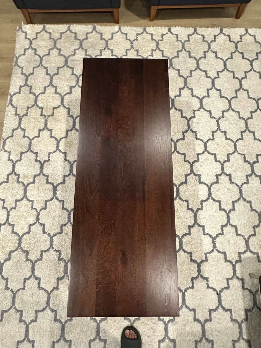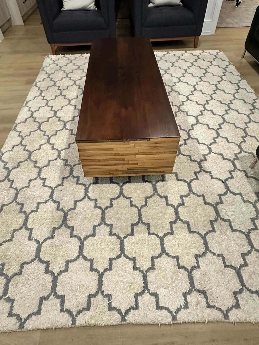 A stylish coffee table with a dark wood top and a unique slatted wood base. It's a great statement piece for your living room!