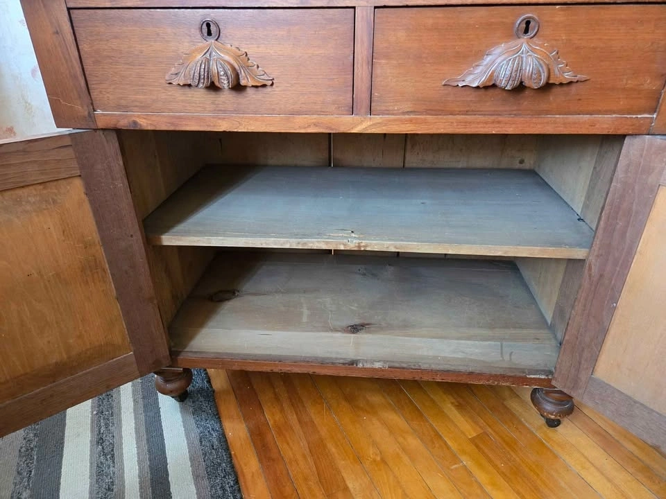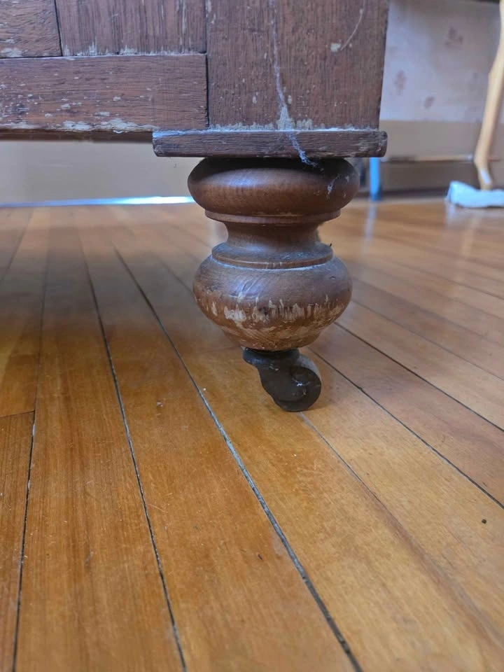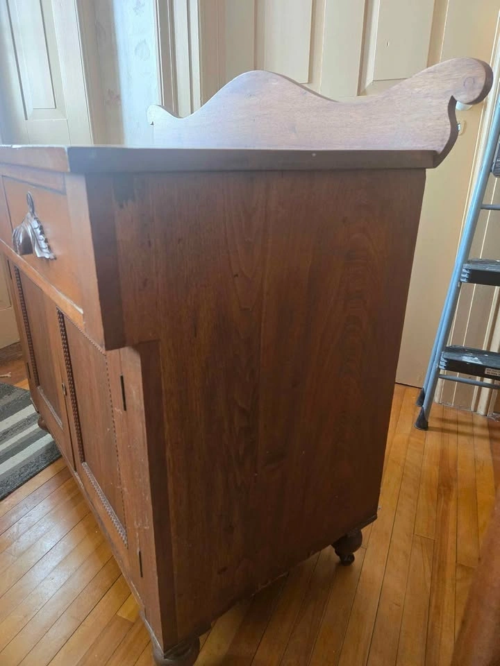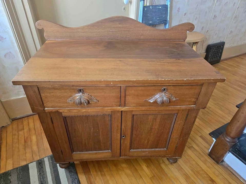 Charming antique wood wash stand, with two wood drawers (wooden mustache pulls). Beautiful piece purchased and refinished by my father many years ago. Was used as vanity in our 1860s farm house for many many years. Will be a beautiful addition to your home, can be used as is! We unfortunately don't have a use for it now and need to make space. Measurements: 38.25" at tallest point, 32" to usable surface. 36" wide, 21" total depth. Located 4 miles southwest of Tavistock on the 16th line.