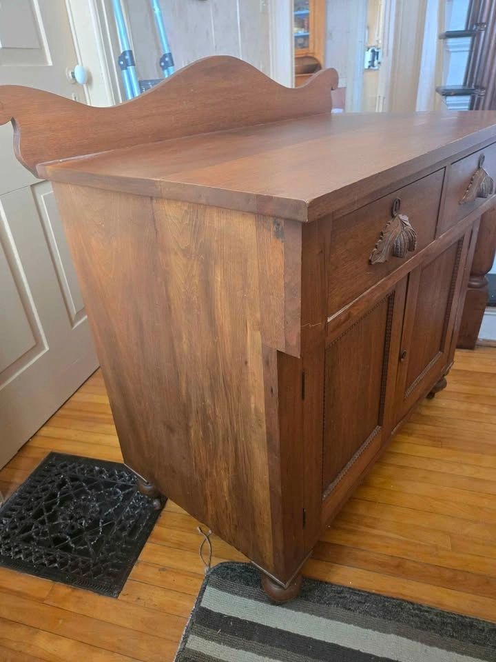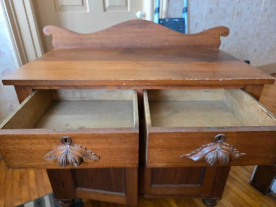 Charming antique wood wash stand, with two wood drawers (wooden mustache pulls). Beautiful piece purchased and refinished by my father many years ago. Was used as vanity in our 1860s farm house for many many years. Will be a beautiful addition to your home, can be used as is! We unfortunately don't have a use for it now and need to make space. Measurements: 38.25" at tallest point, 32" to usable surface. 36" wide, 21" total depth. Located 4 miles southwest of Tavistock on the 16th line.
