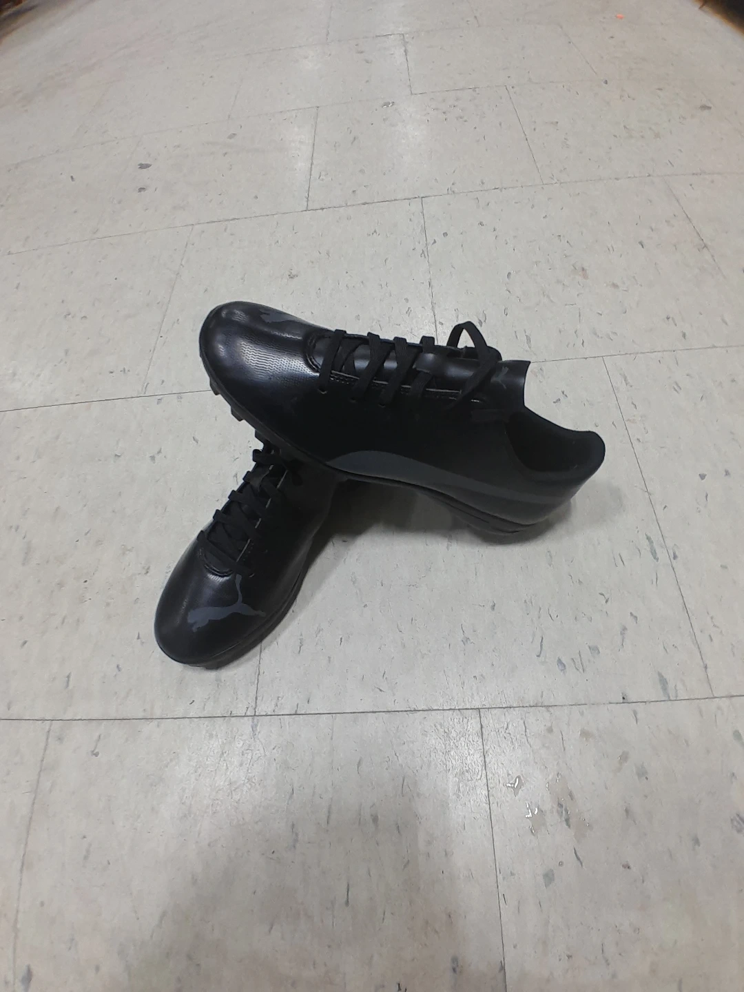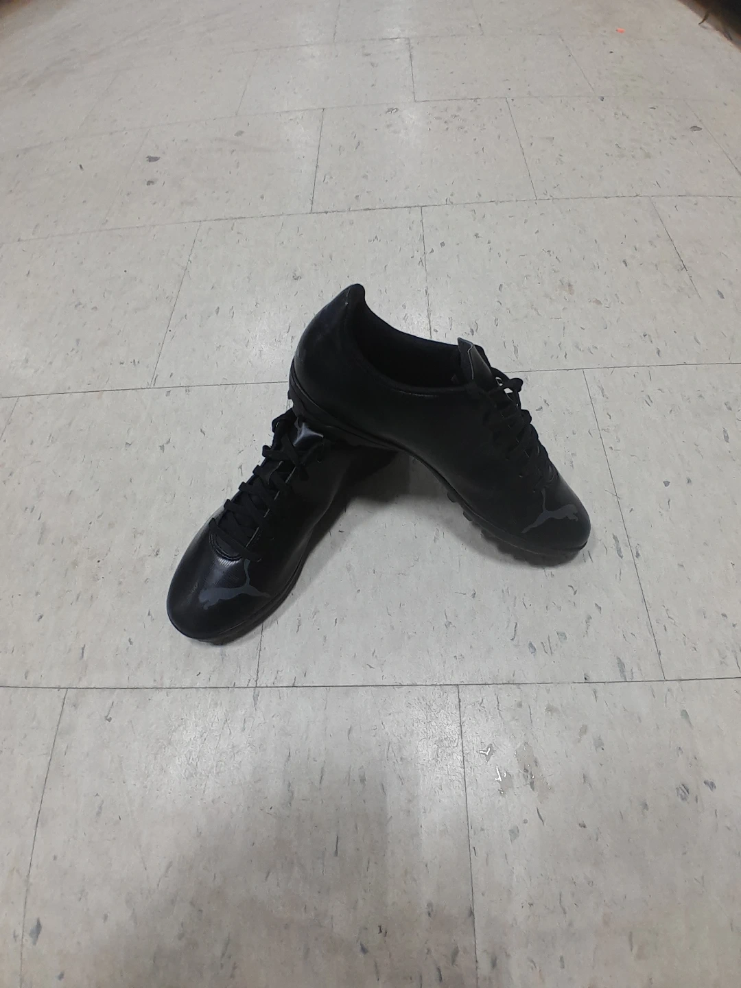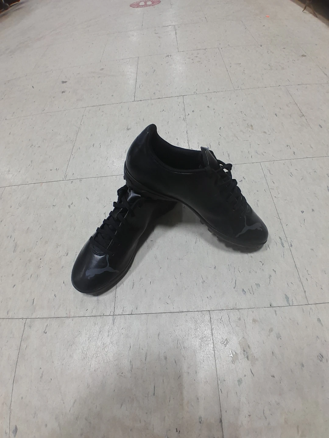 Black Puma soccer cleats. They have a synthetic upper and a durable rubber outsole for traction. Cleats are suitable for turf surfaces men's size 8