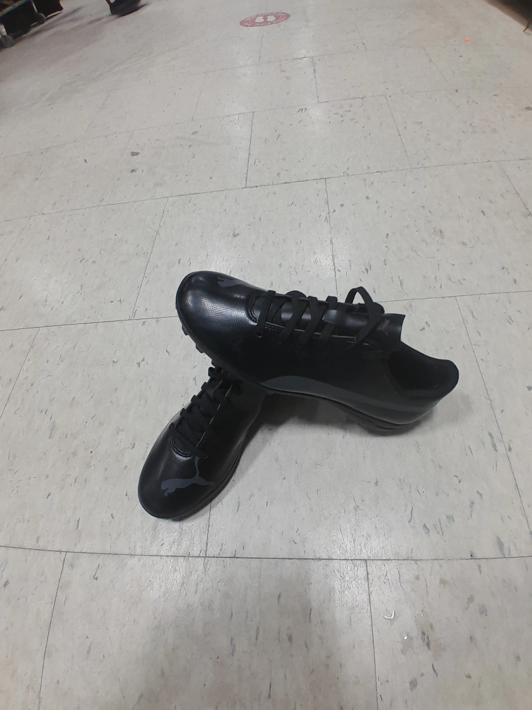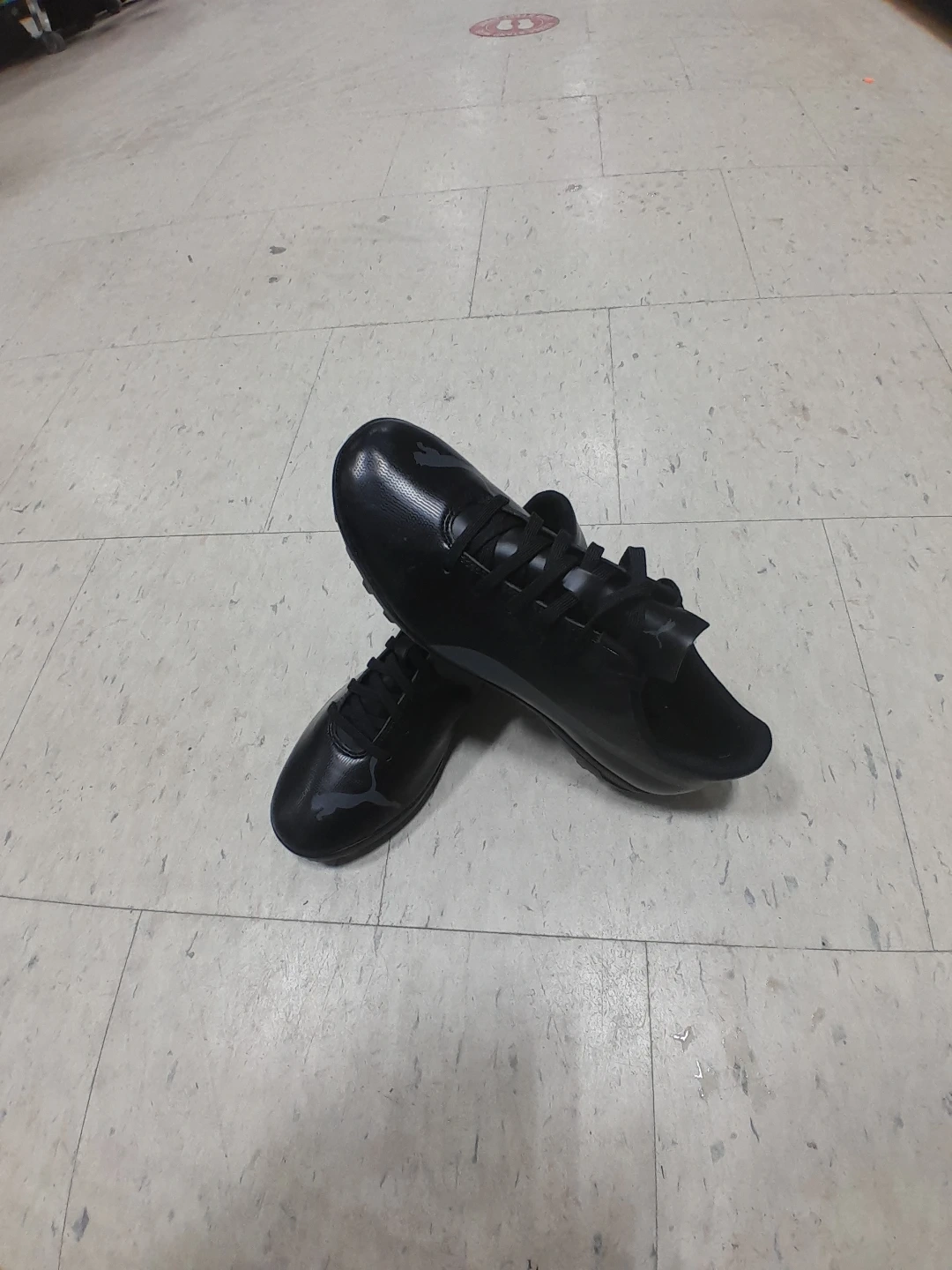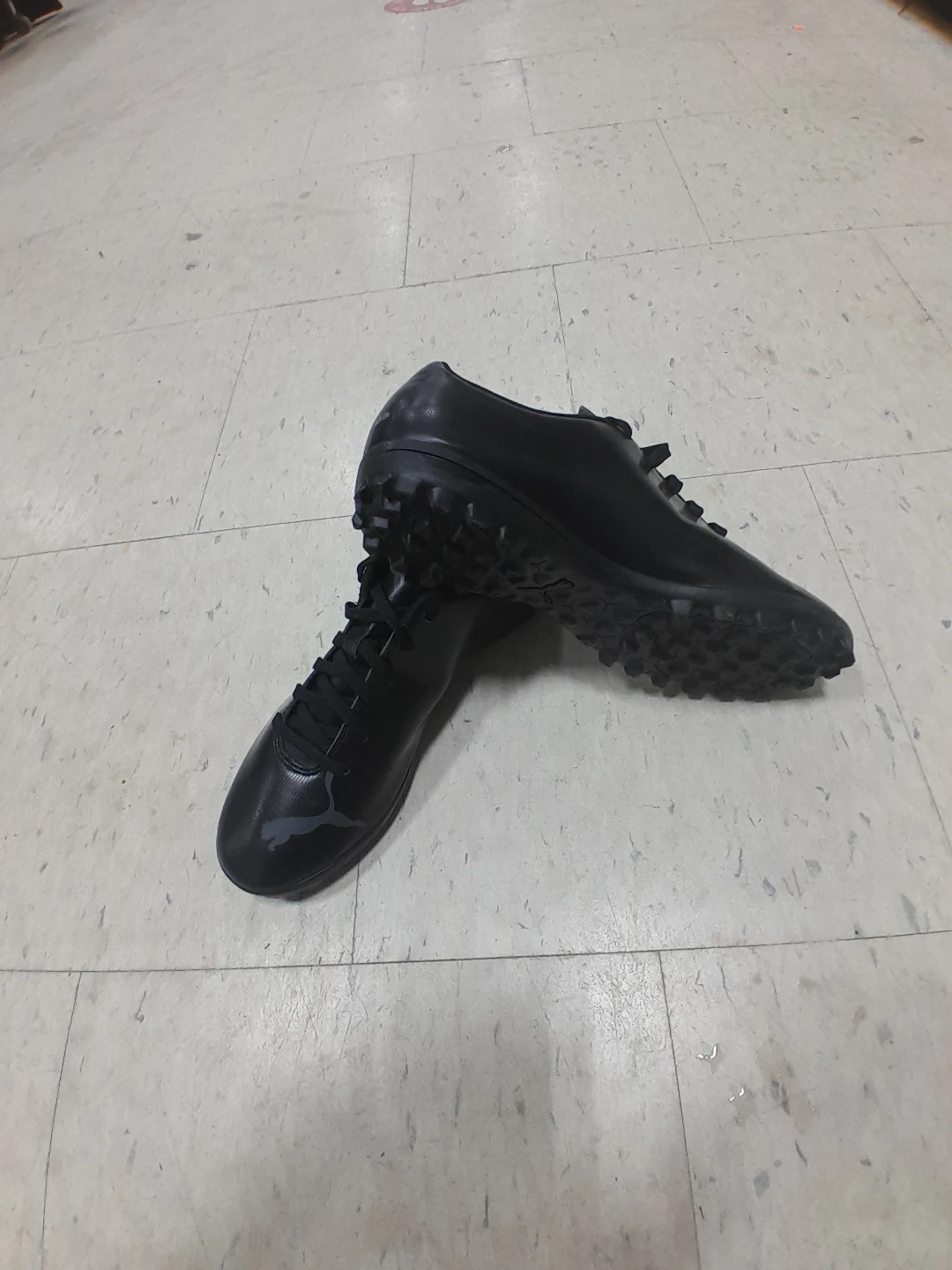 Black Puma soccer cleats. They have a synthetic upper and a durable rubber outsole for traction. Cleats are suitable for turf surfaces men's size 8
