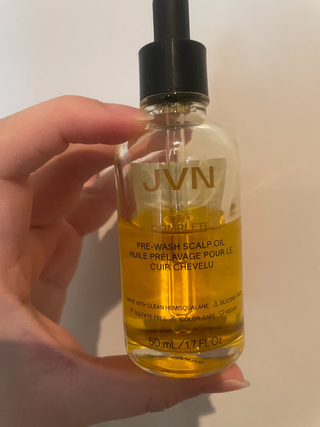 JVN Complete Pre-Wash Scalp Oil in a 50ml bottle. It's made with clean hemisqualane and is silicone-free, sulfate-free, and color-safe. This oil is also vegan.