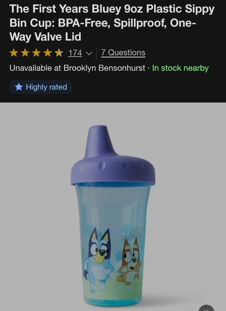 This is The First Years Bluey 9oz sippy cup. It's BPA-Free and spillproof with a one-way valve lid. Plastic construction.