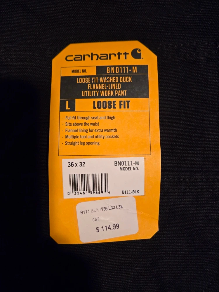 Carhartt loose fit washed duck flannel-lined utility work pant. They're black and size (36x32). These pants feature a flannel lining for extra warmth. They also have multiple tool and utility pockets, and a straight leg opening. Originally bought for $114.99