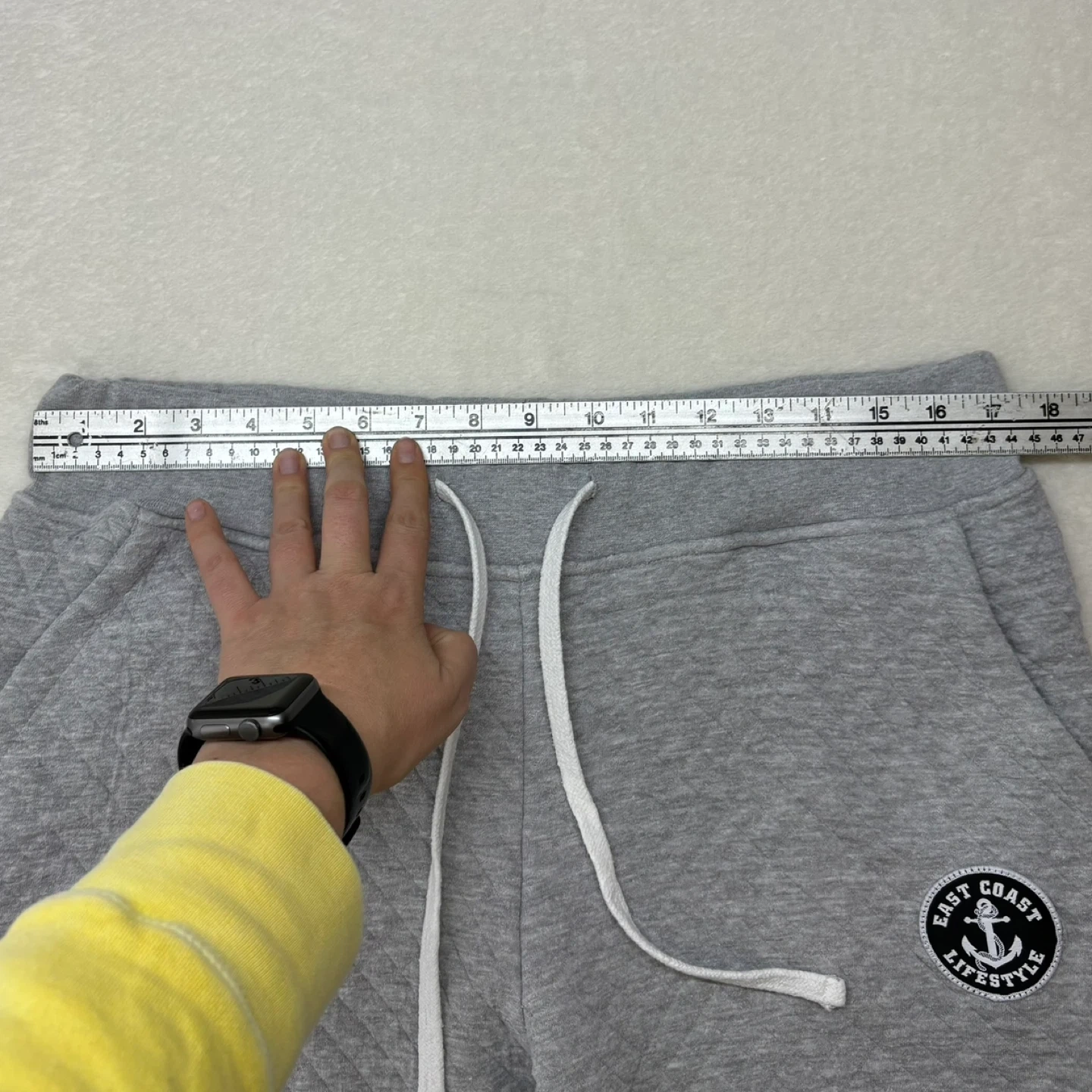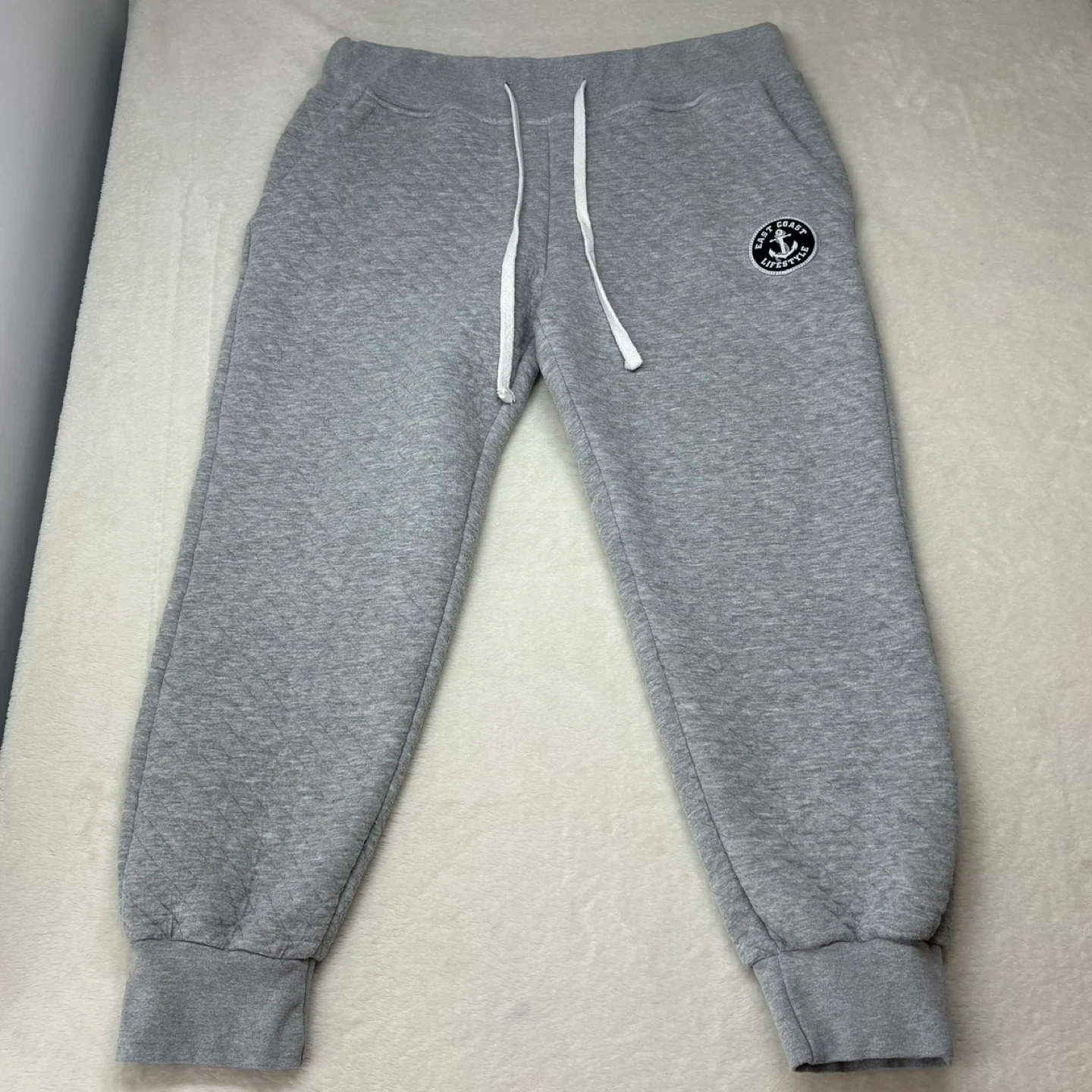 These cozy grey sweatpants feature a unique quilted diamond pattern and a relaxed, oversized fit. They are designed with a comfortable elastic drawstring waistband, ribbed cuffs, pockets and an East Coast Lifestyle anchor logo patch on the hip.