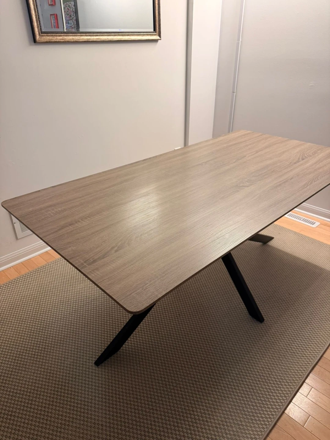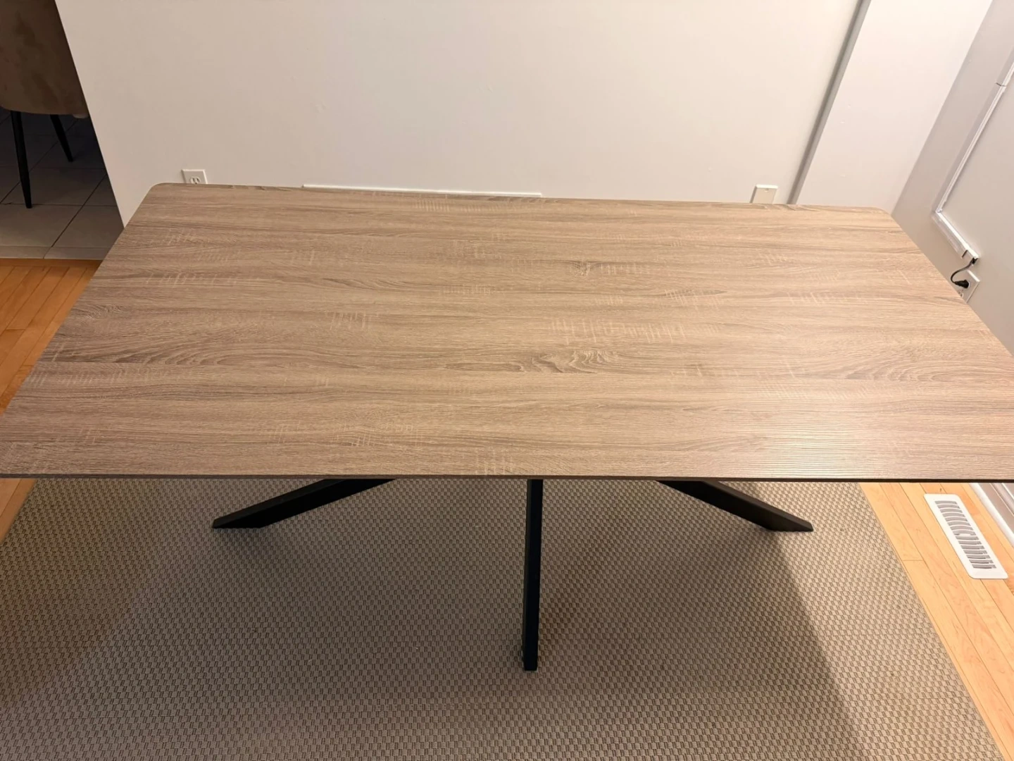 A contemporary dining table with a light wood-look laminate top and a sturdy black metal X-shaped base. It's perfect for everyday meals and gatherings. The table's surface measures 71 inches long and 31 inches wide.