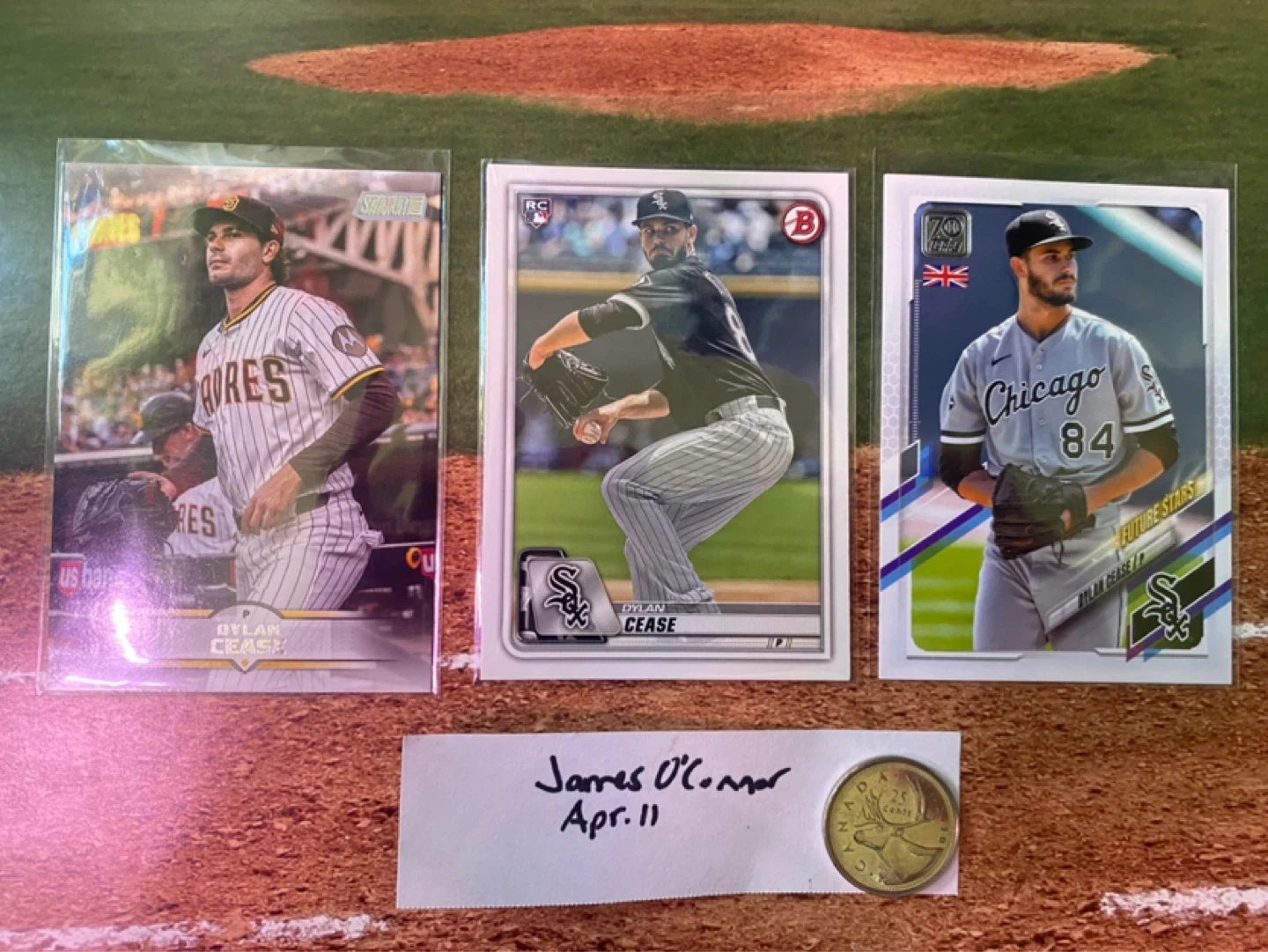 Lot of three Dylan Cease baseball cards. Includes Stadium Club and Topps cards featuring the player in his Padres and Chicago White Sox uniforms. Cards are in protective sleeves.