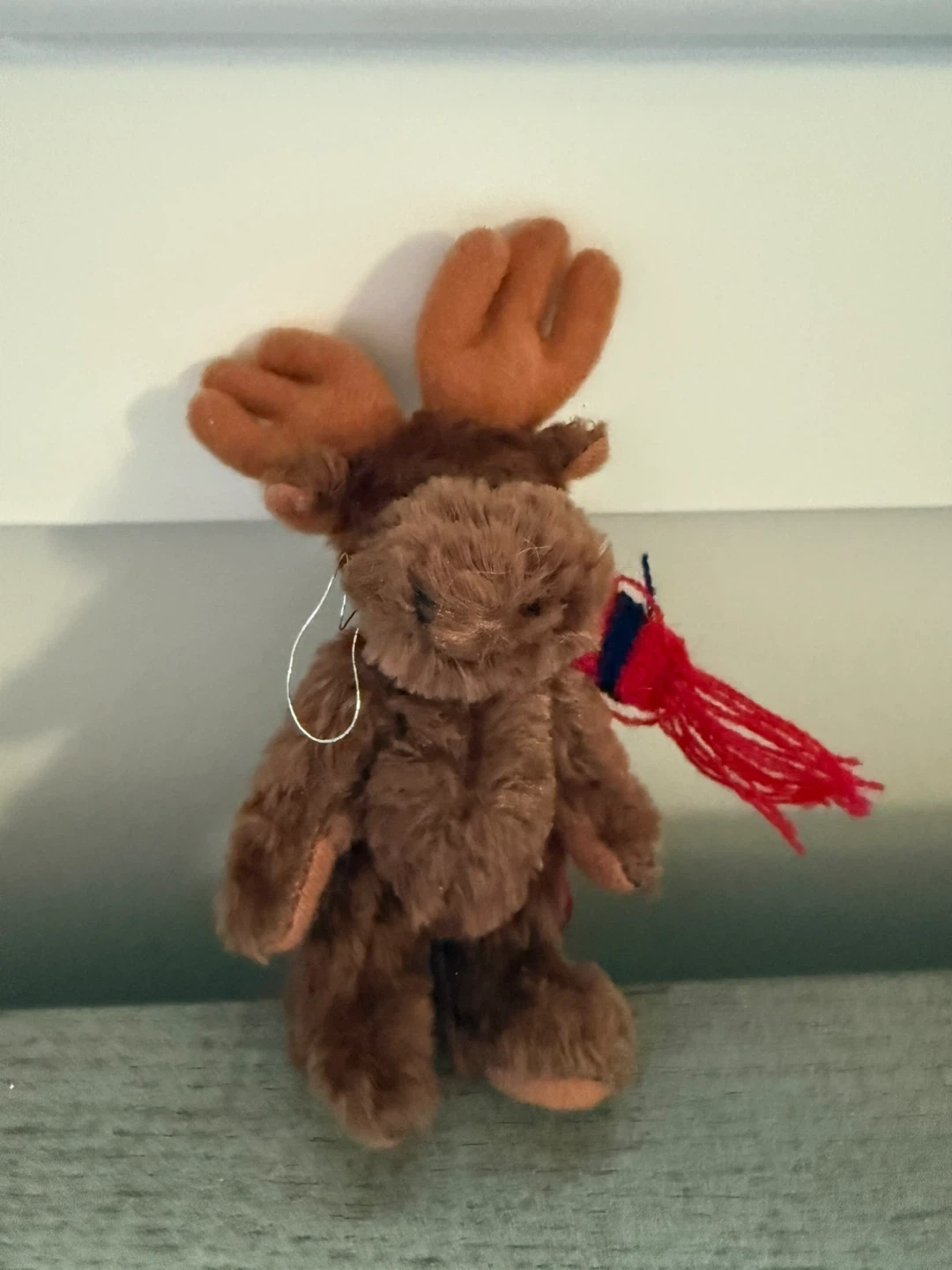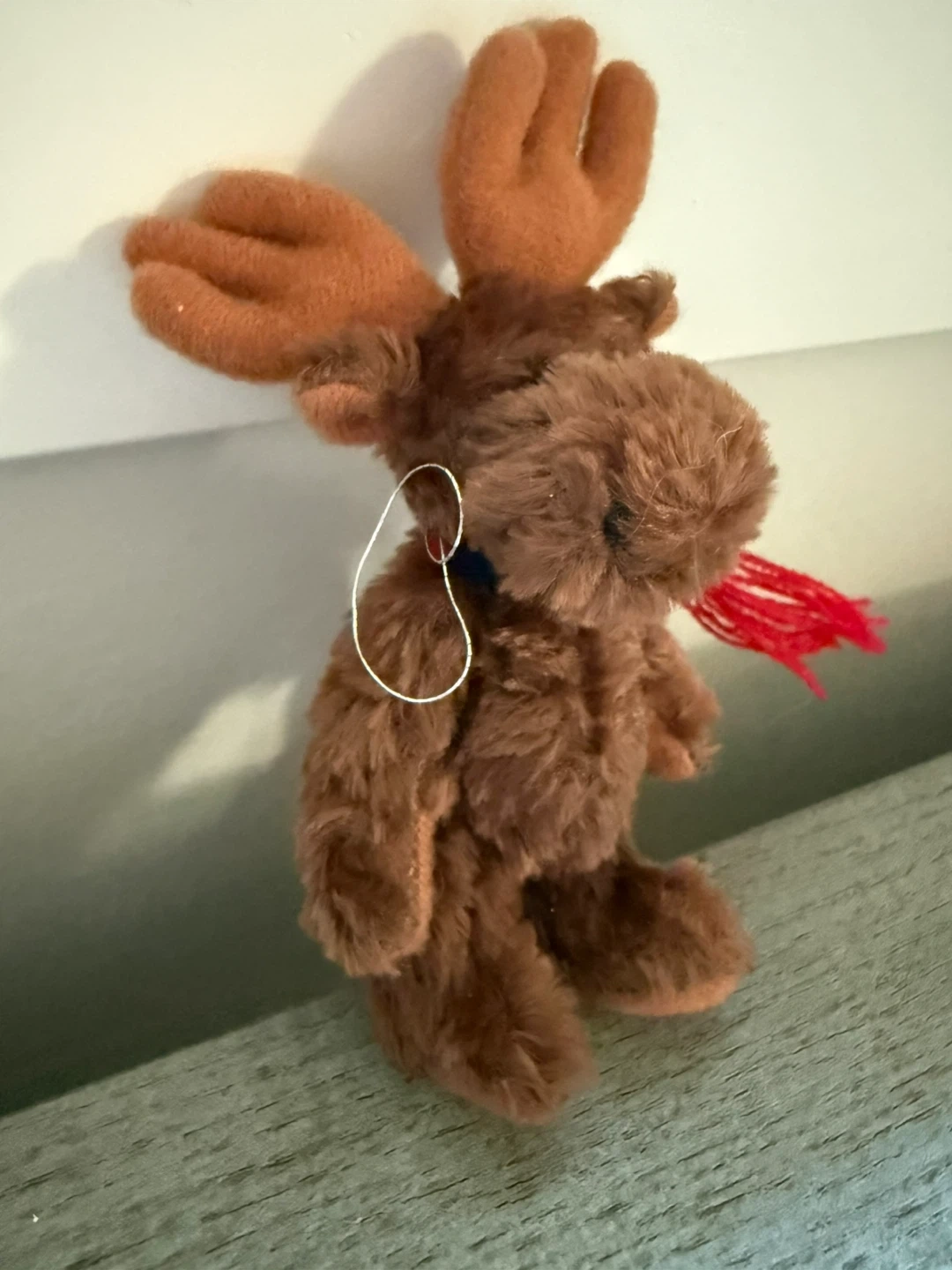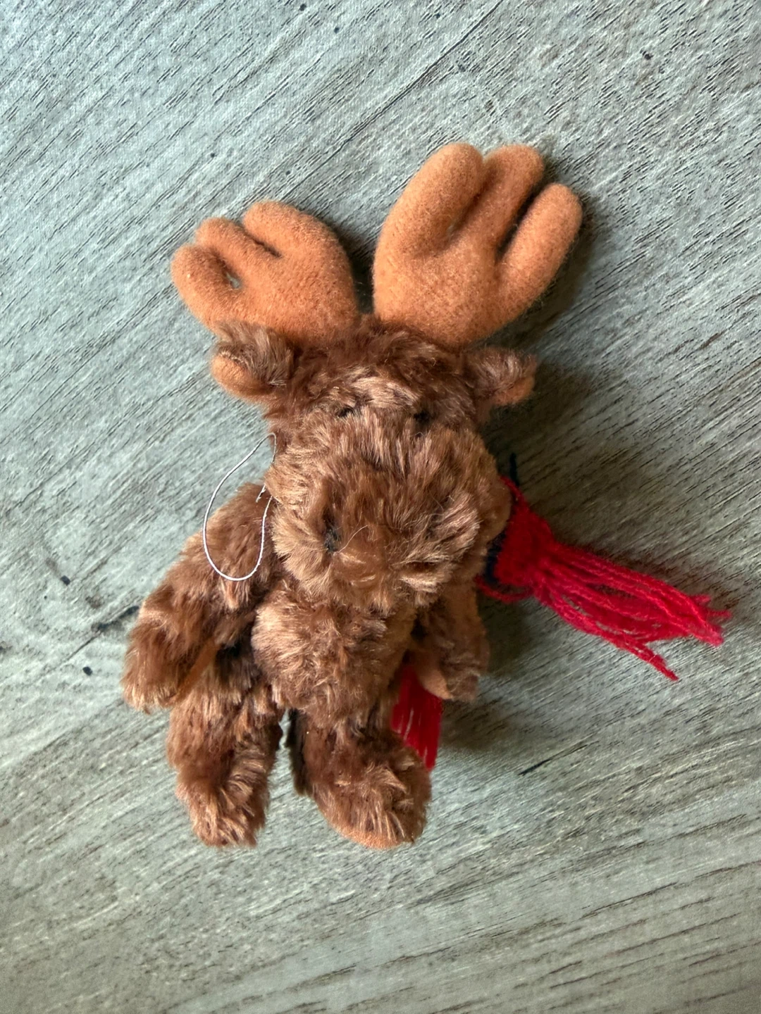 This is a small, fluffy plush moose ornament. It has orange antlers and a red yarn scarf. It's made of soft brown material. This little guy would make a cute addition to holiday decor!