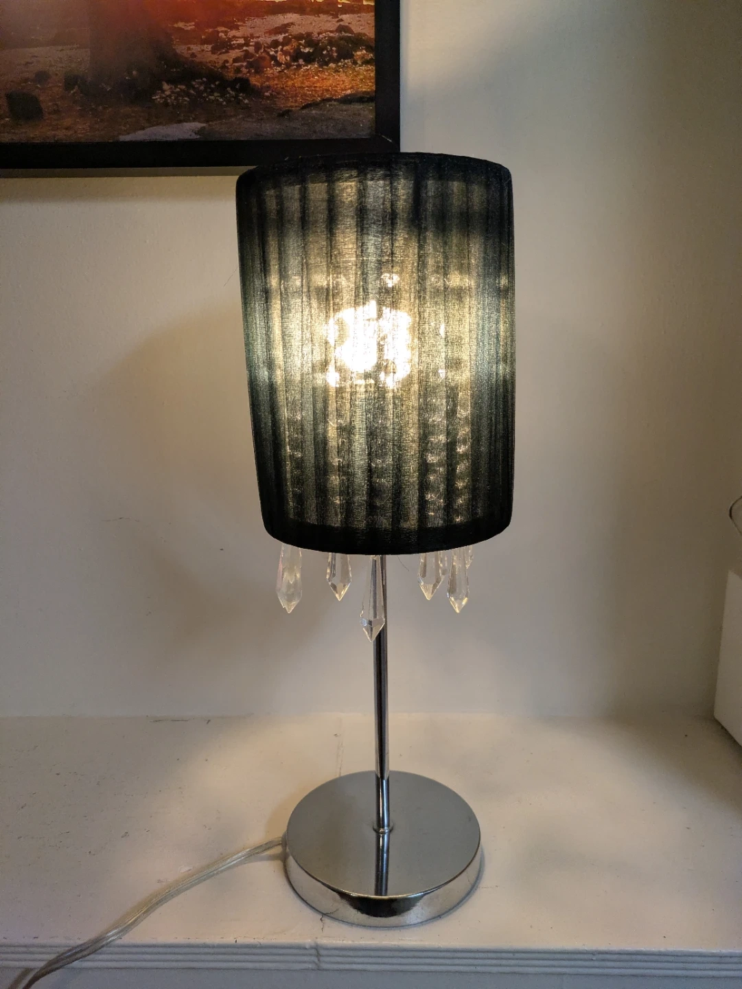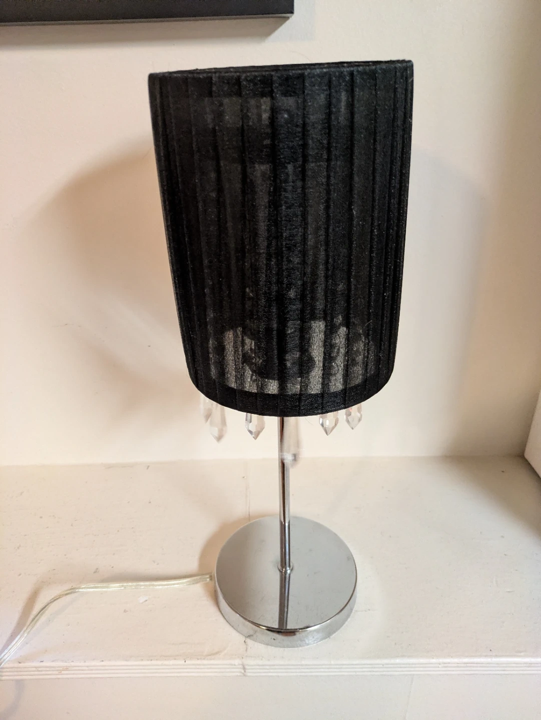Add a touch of sparkle to any room with this stylish black pleated table lamp. It features a pleated fabric shade and is adorned with dangling crystal-like accents. The sleek chrome base and stem give it a modern look. It's perfect for bedside tables or as an accent lamp. Some jewels are missing but lamp is working great! Measures 16.75" inches high.