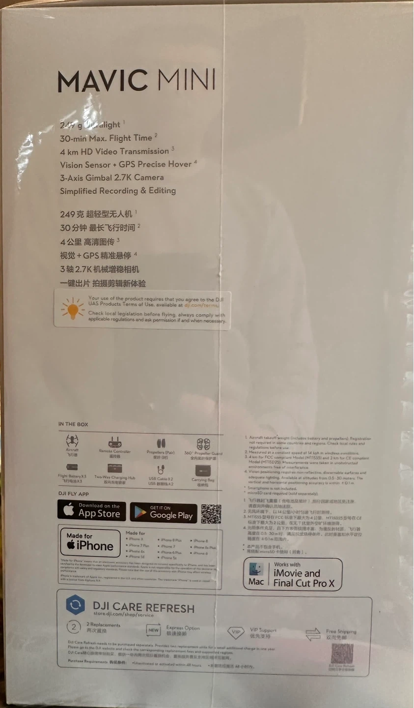 The DJI Mavic Mini is an ultra-light drone weighing just 249g. This Fly More Combo includes the drone, a remote controller, three batteries, and a carrying bag. It offers 30 minutes of flight time and 4 km HD video transmission.