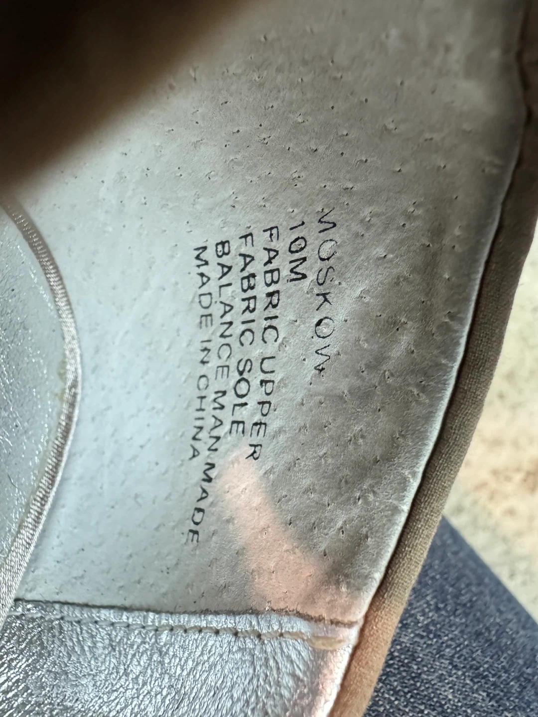 They feature a fabric upper and fabric sole with a metallic heel and platform. Made in China.