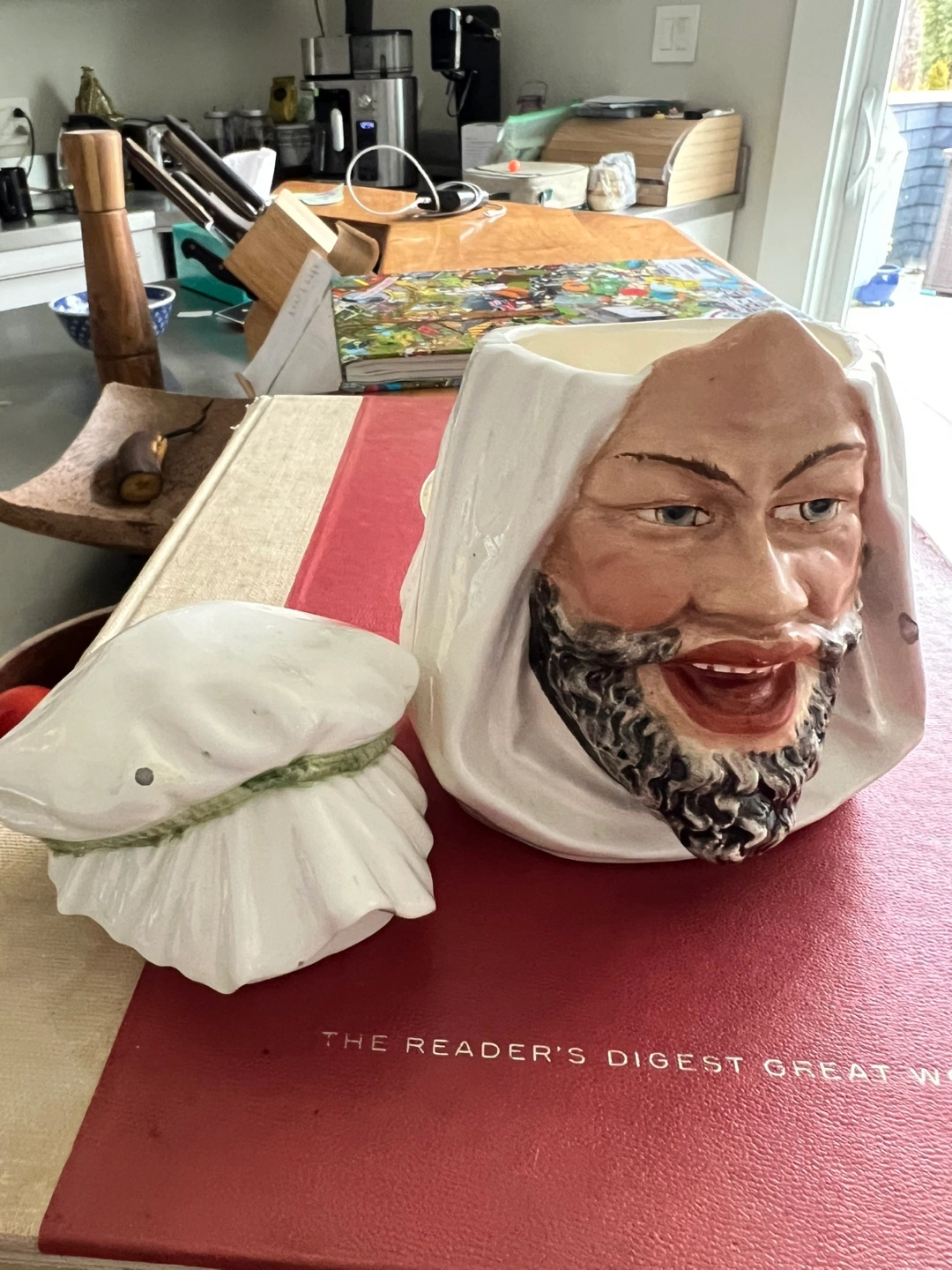 Unique vintage jar. Features a man's head and removable lid. Ceramic construction. Shows some minor wear consistent with age and use. A fun addition to your kitchen decor!