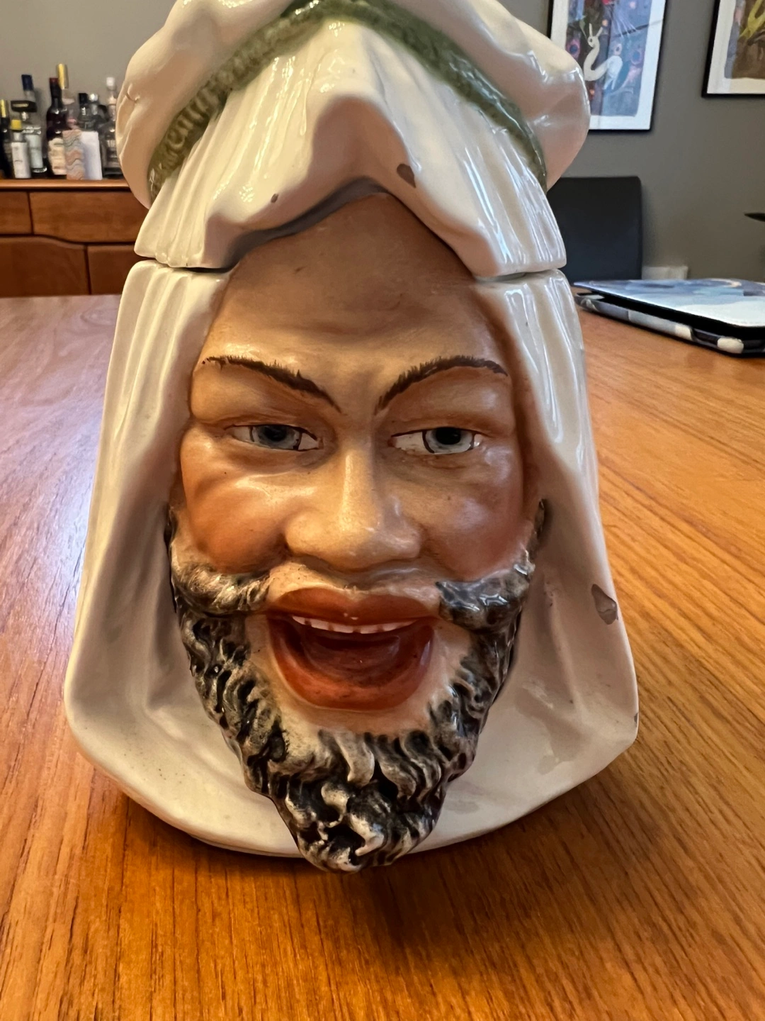 Unique vintage jar. Features a man's head and removable lid. Ceramic construction. Shows some minor wear consistent with age and use. A fun addition to your kitchen decor!