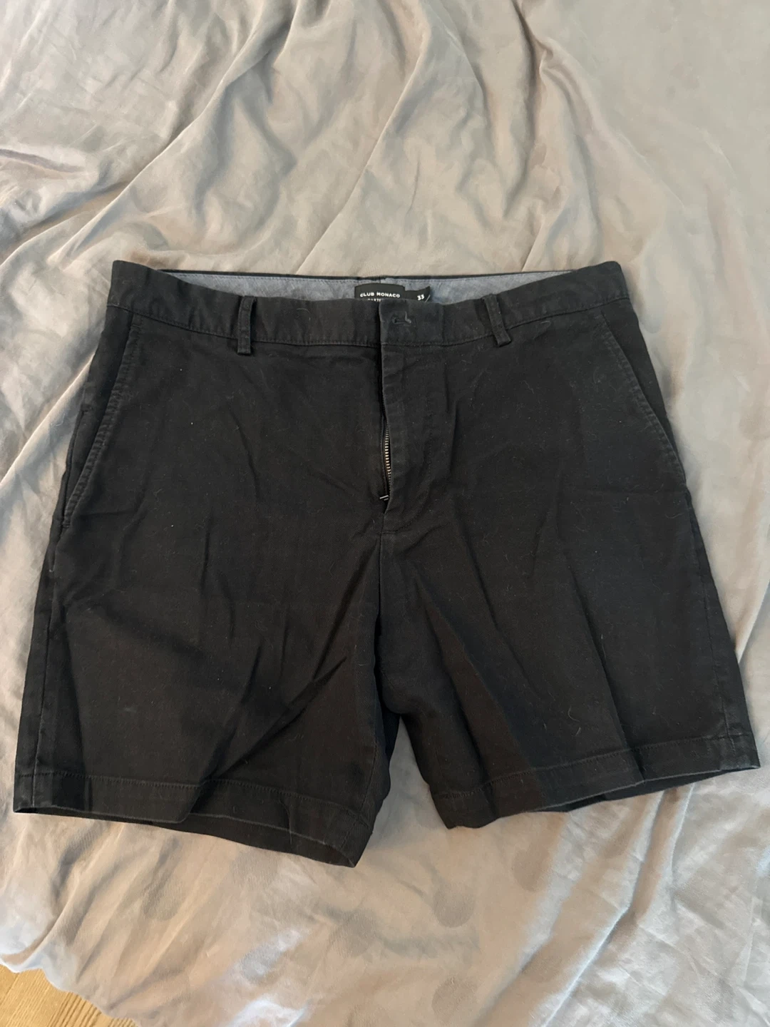 Club Monaco Baxter Fit shorts in black. These shorts are men size 33. They're a staple for warm weather! Cotton blend material.