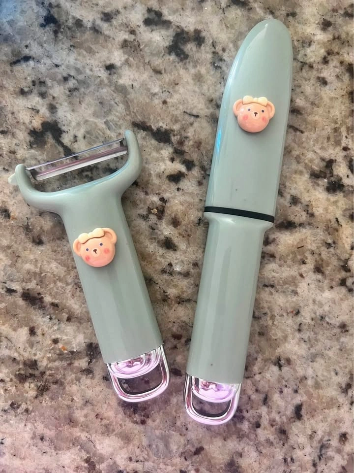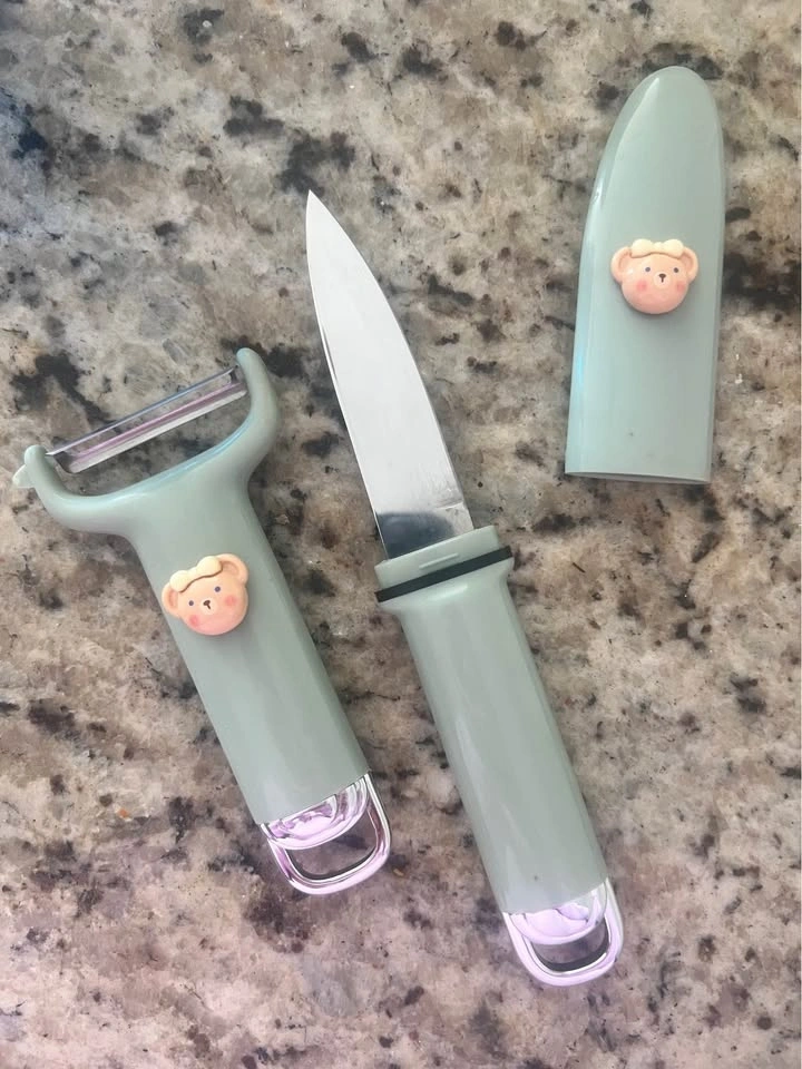 Adorable mini kitchen tool set with cute bear design. Includes: Stainless steel vegetable/fruit peeler, small stainless steel fruit knife with protective cover. Great for peeling fruits, veggies, and small kitchen tasks. Compact, lightweight, and easy to store. Pickup: Burnaby / SkyTrain station meetup available.