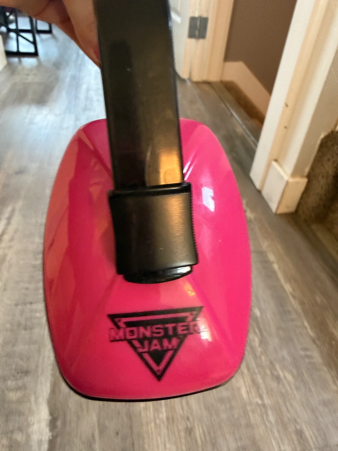 Bright pink Monster Jam protective for kids. Offers protection from loud noises. Adjustable headband for a comfortable fit.