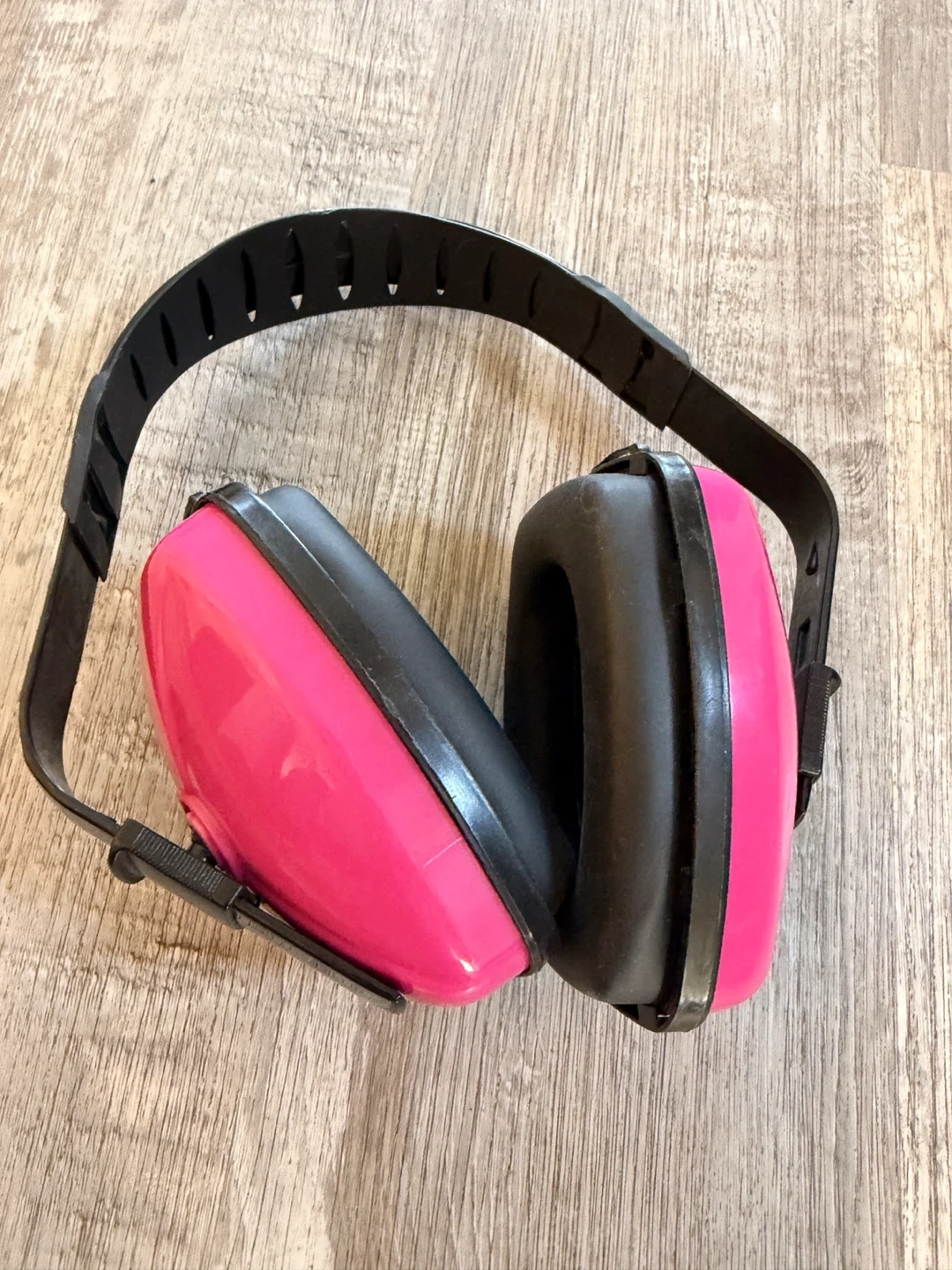 Bright pink Monster Jam protective for kids. Offers protection from loud noises. Adjustable headband for a comfortable fit.