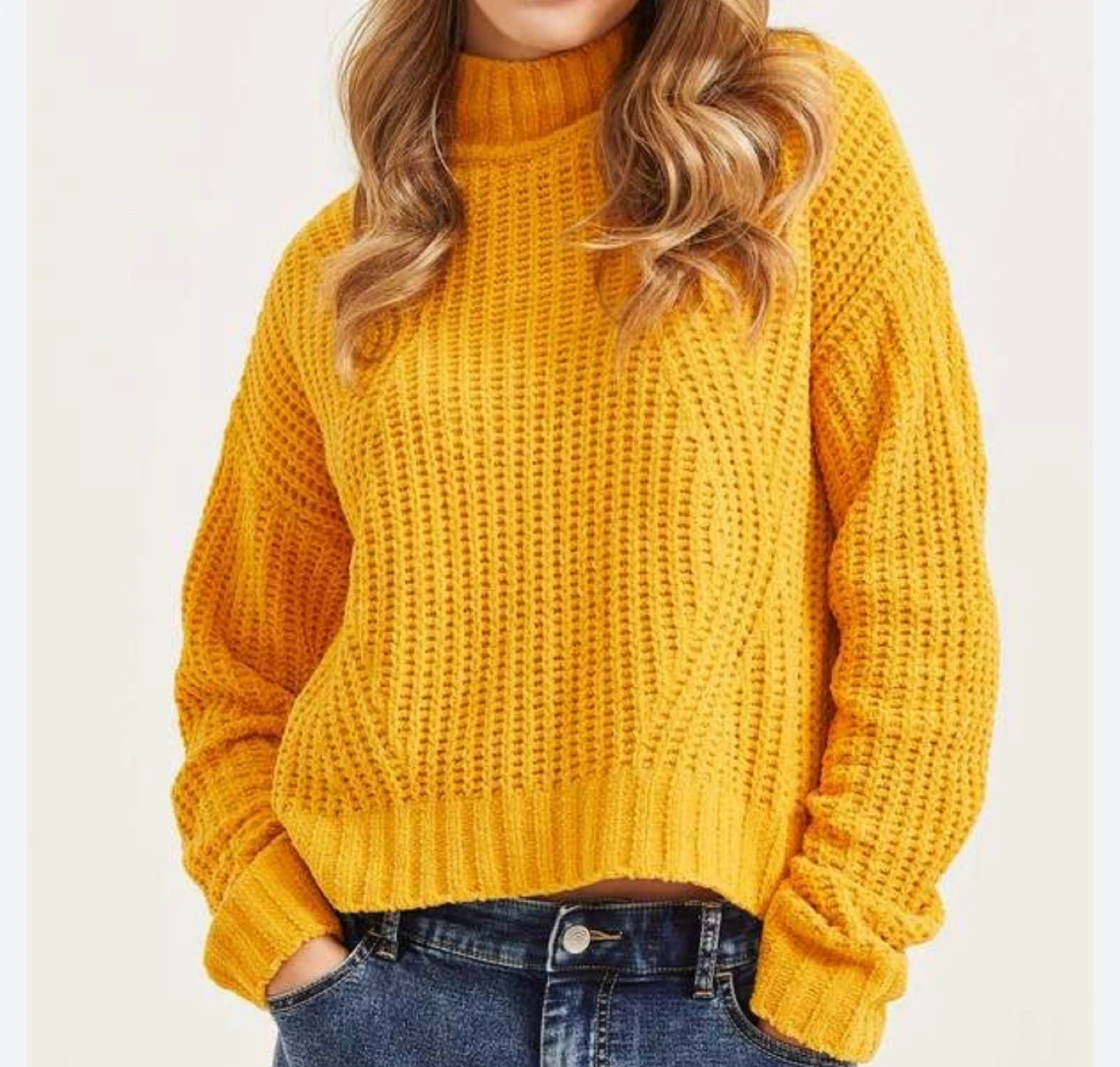 A cozy yellow knit sweater, perfect for layering or wearing on its own! The material is soft and comfortable, making it a great addition to any wardrobe