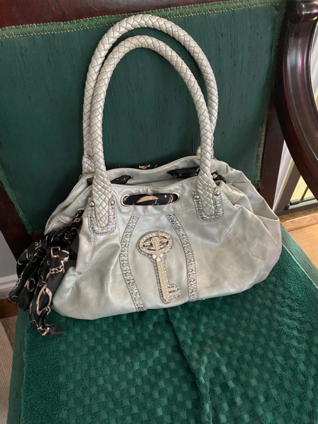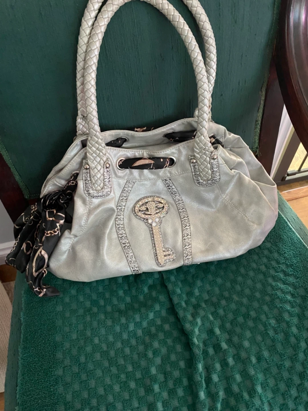 This is a pre-owned silver purse that's both stylish and functional, perfect for adding a touch of sparkle to any outfit. The bag features a unique key embellishment and braided handles. The purse contains a patterned lining with multiple pockets and a zippered closure, blending fashion with practicality.