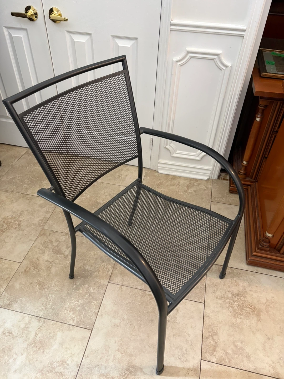 This black metal patio chair features a diamond mesh seat and back. It comes with a comfortable pink tufted cushion. Perfect for your porch or backyard seating!