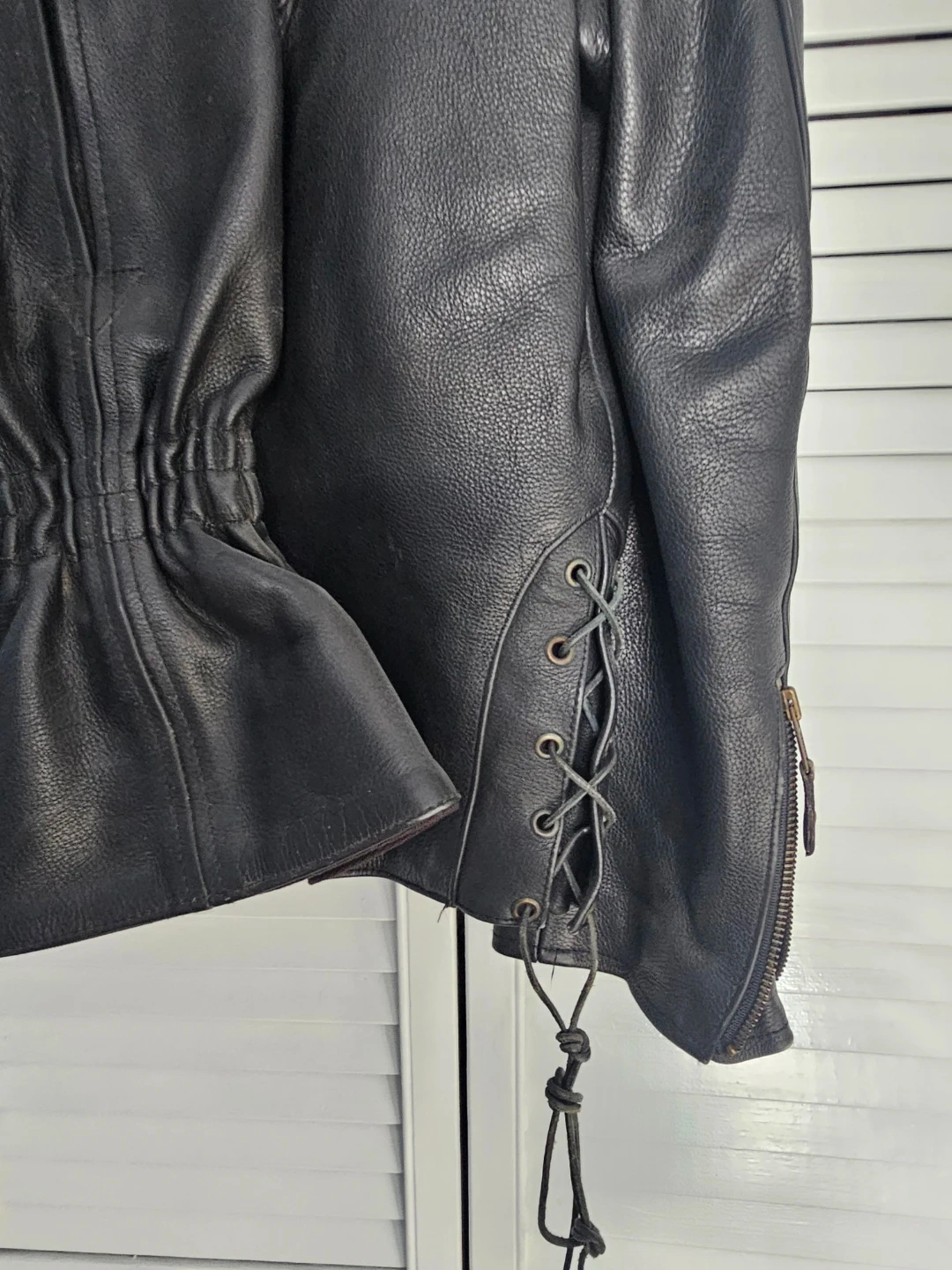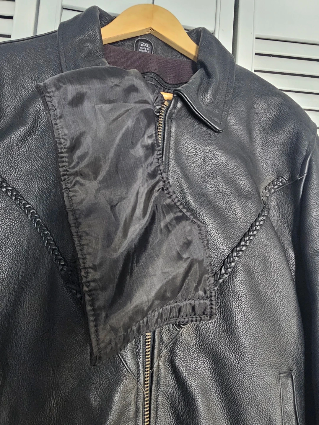 Black leather motorcycle jacket with braided accents and lace-up sides. Size is 2XL. Made in Pakistan, designed in the U.S.A. A classic look for riders!