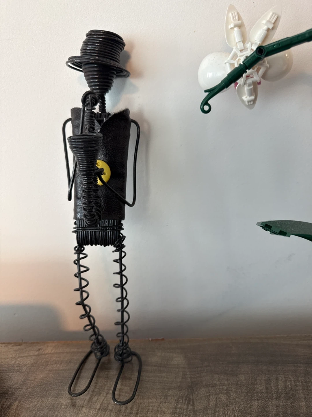 This is a fun wire figurine dressed in a hat and holding a saxophone. It's made of black wire with a black leather-like torso accented by a yellow button. The legs have a coiled spring design.