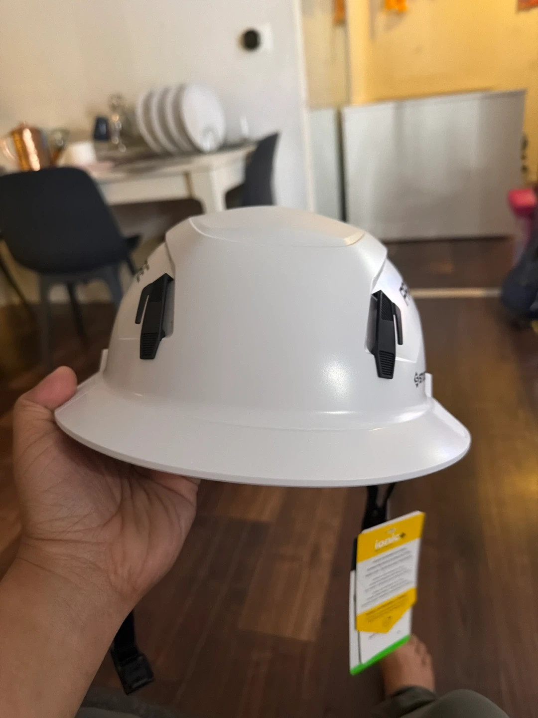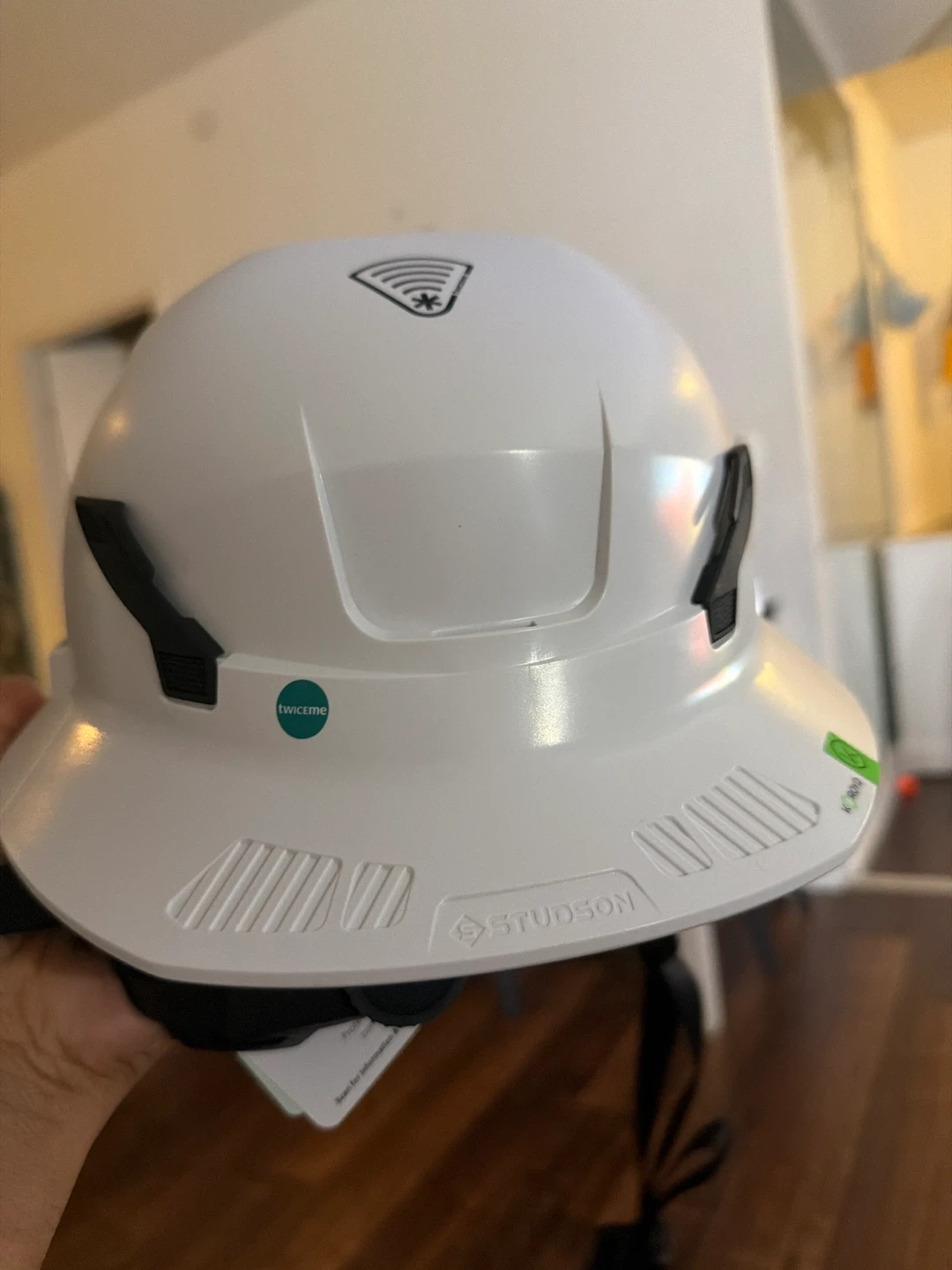 This is a white Studson hard hat. It's designed for impact protection and features a comfortable suspension system. It's suitable for construction sites or any environment requiring head protection.