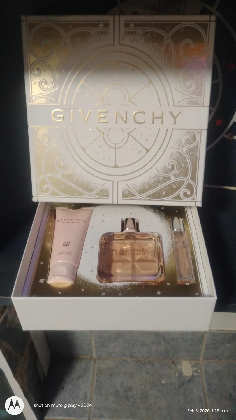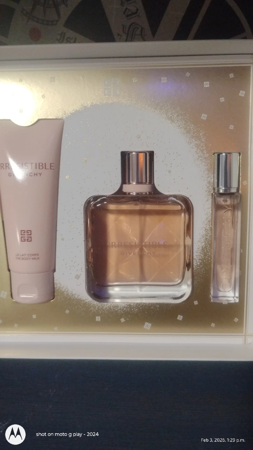 This is a Givenchy Irresistible gift set. It includes an 80ml Eau de Parfum spray, a 75ml body milk, and a 15ml travel spray. Makes a lovely gift!🏆