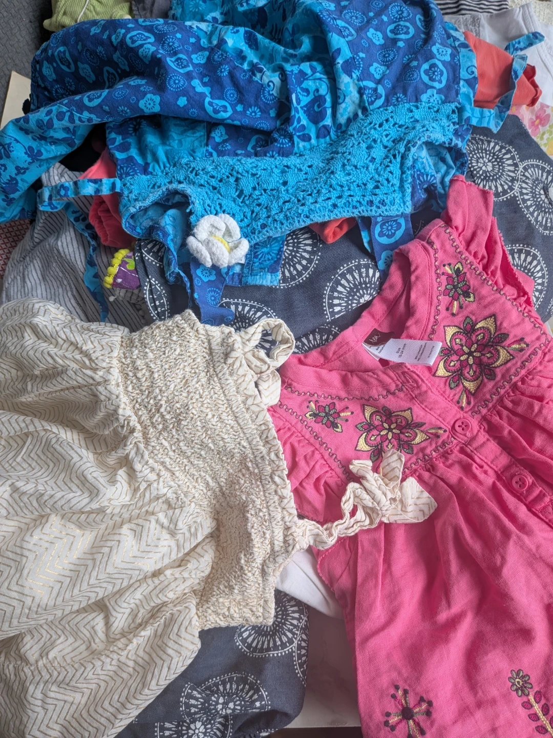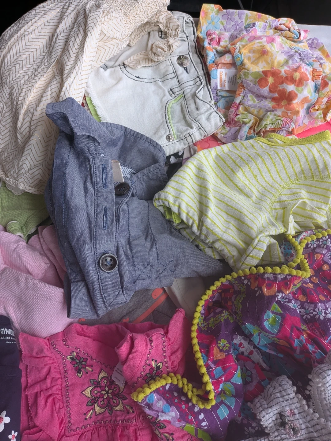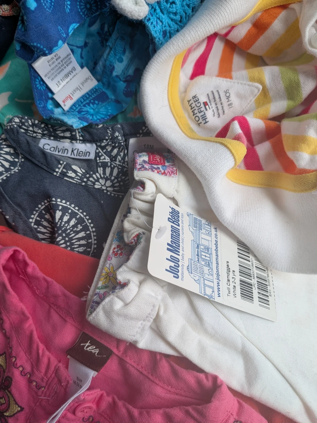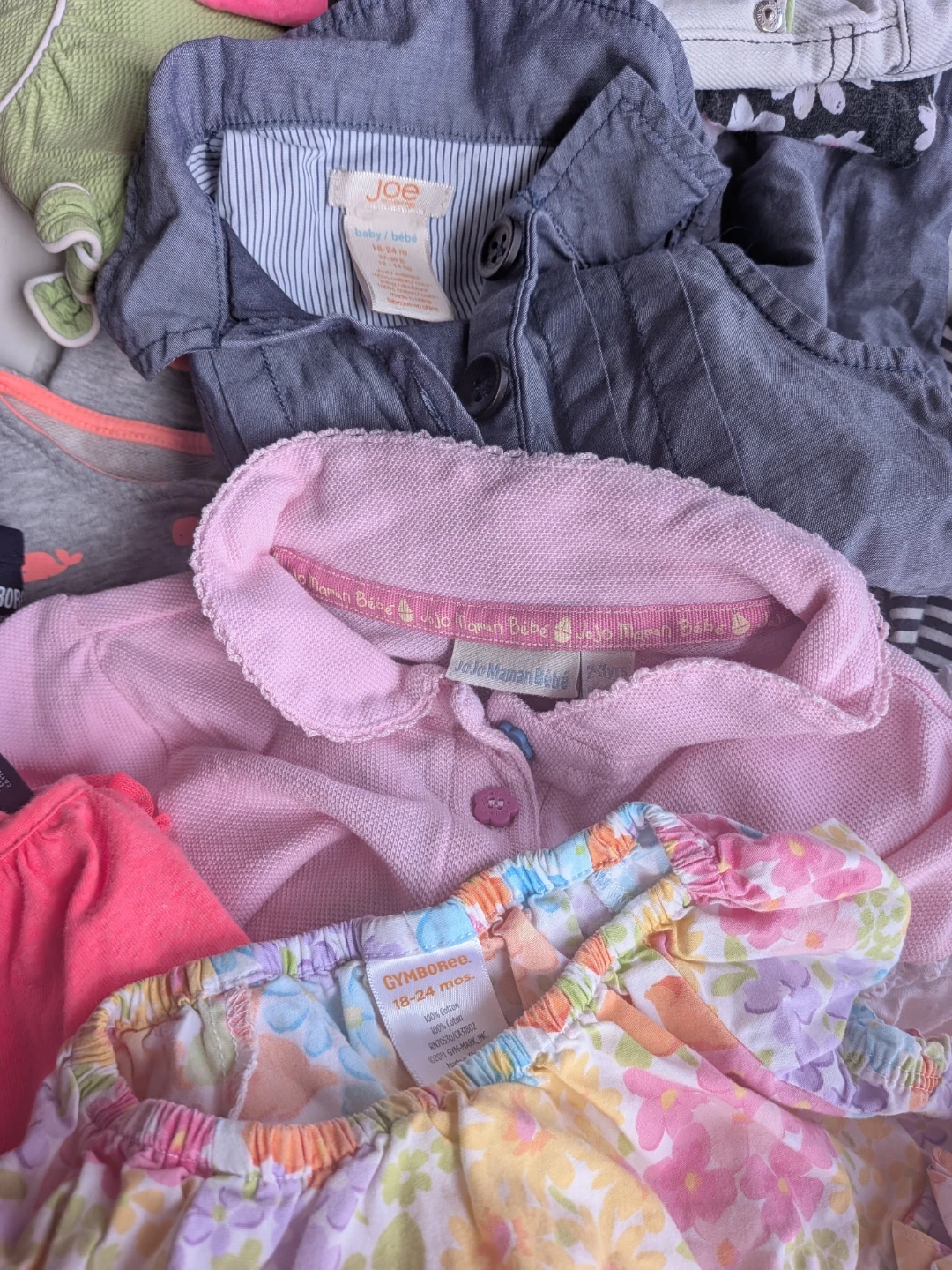 This large bundle includes a variety of baby and kids clothing items. Brands include Gymboree, BabyGap, Joe, Calvin Klein, and Tommy Hilfiger. Most items are sized 12-24 months