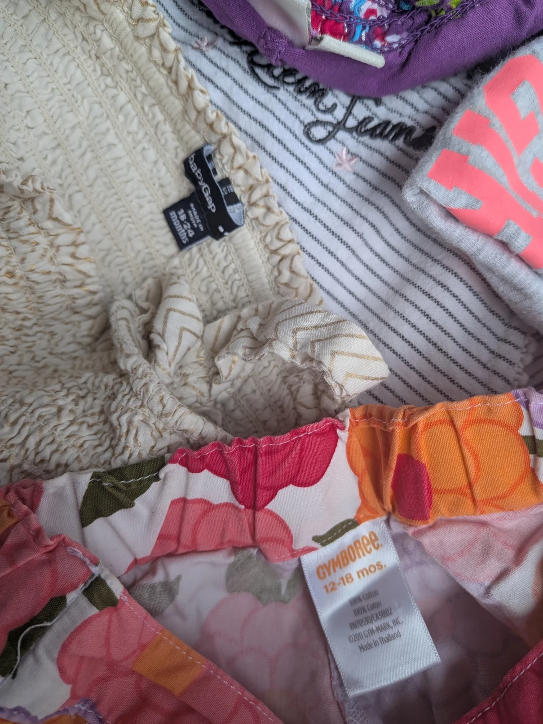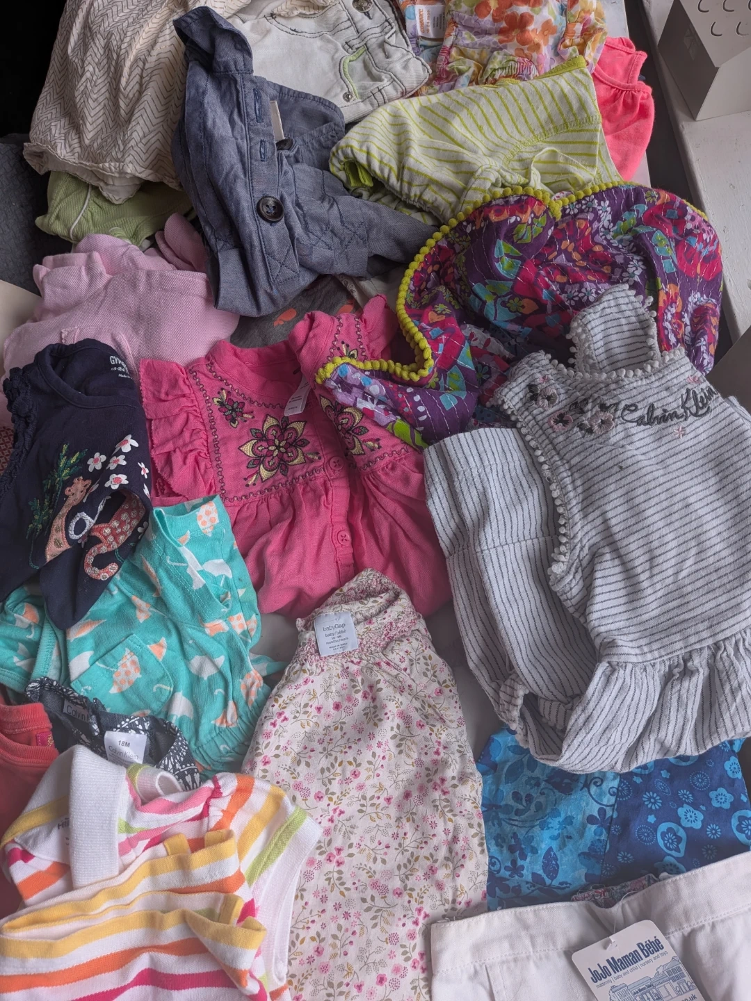 This large bundle includes a variety of baby and kids clothing items. Brands include Gymboree, BabyGap, Joe, Calvin Klein, and Tommy Hilfiger. Most items are sized 12-24 months