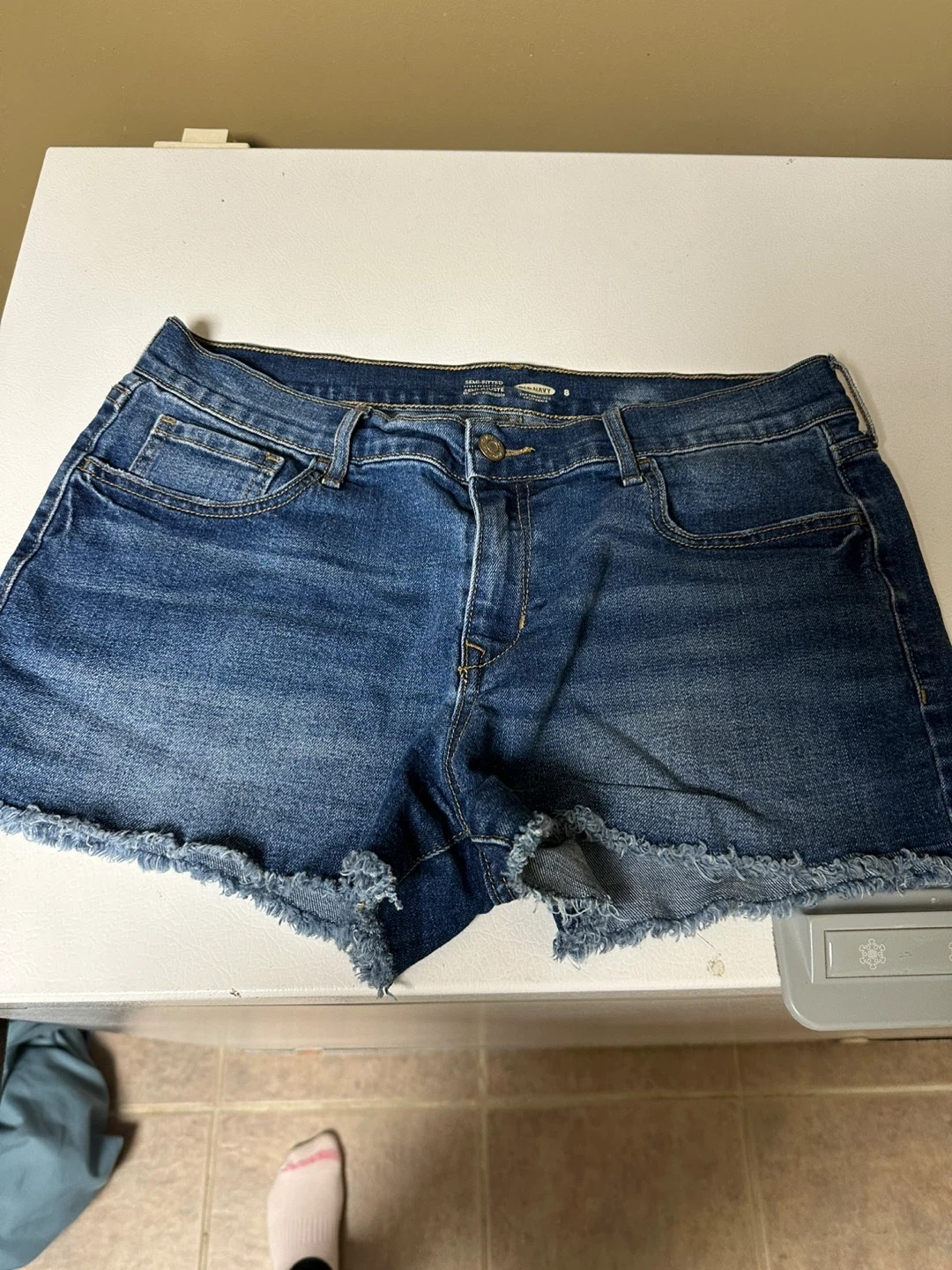 Selling a pair of Old Navy denim shorts in size 8. They are in great condition and have a cute, frayed hem. Perfect for summer!