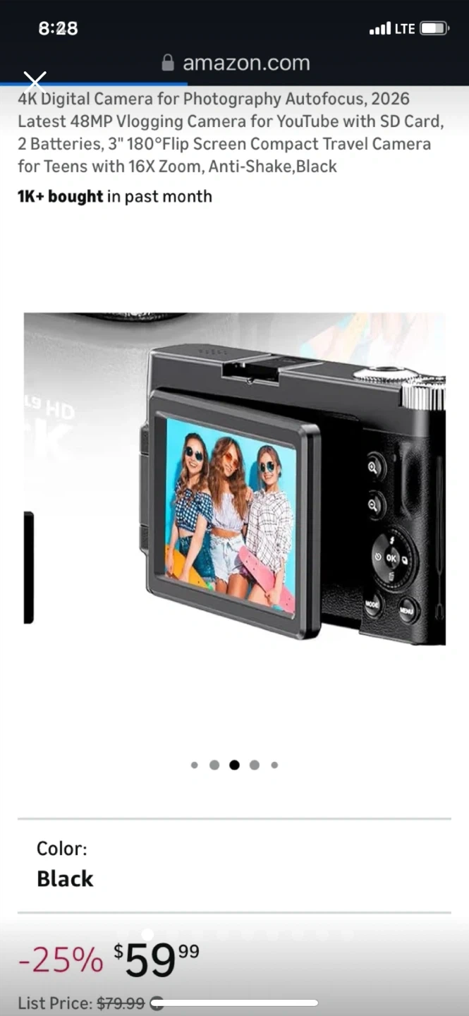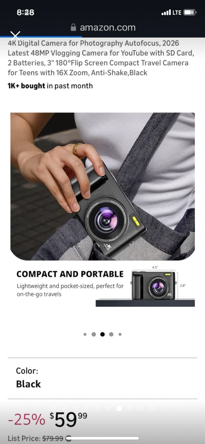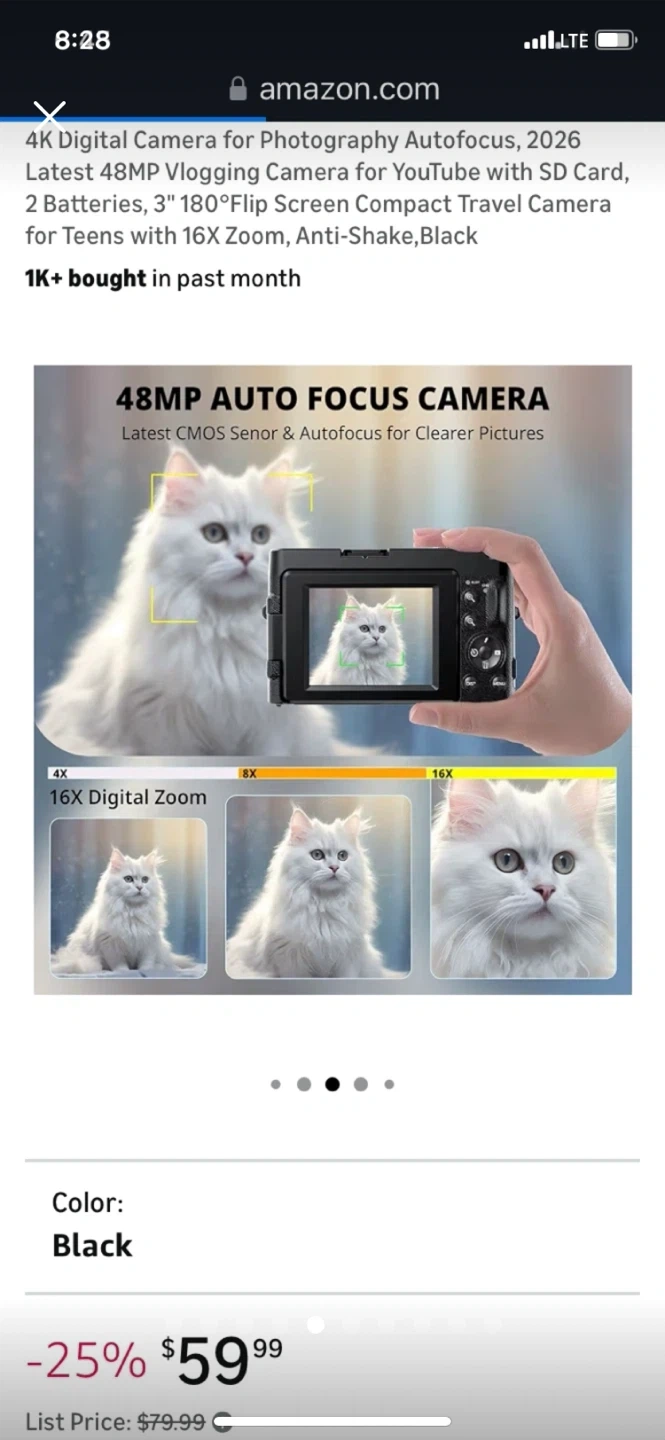 This 4K digital camera has a 48MP sensor and 16x digital zoom. It features a 3-inch 180-degree flip screen and anti-shake capabilities. Includes 2 batteries and SD card support.