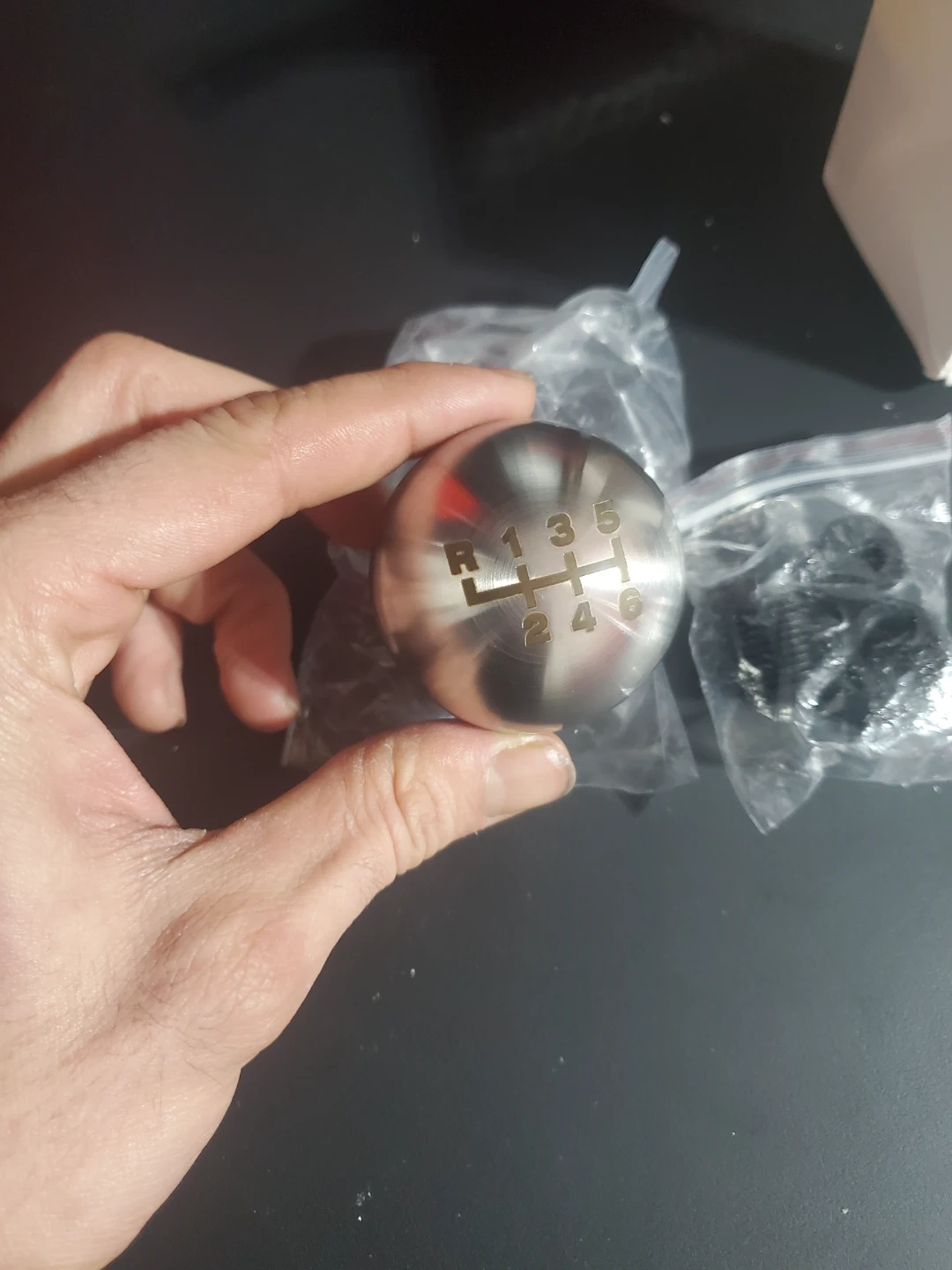 This is a 6-speed manual shift knob. It's made of brushed metal with the gear pattern etched on top. Includes adapters for installation. Comes with screw on fittings
