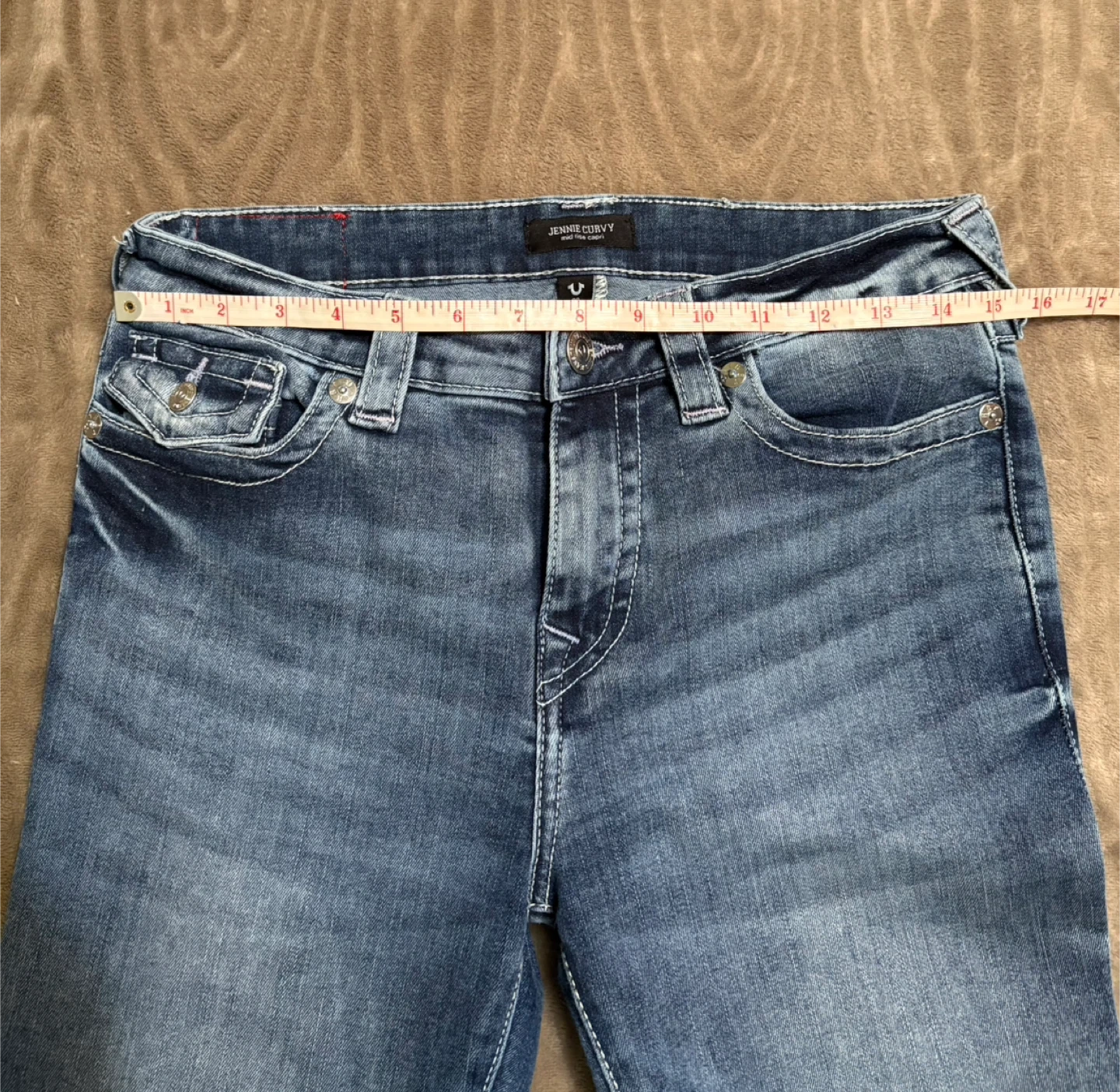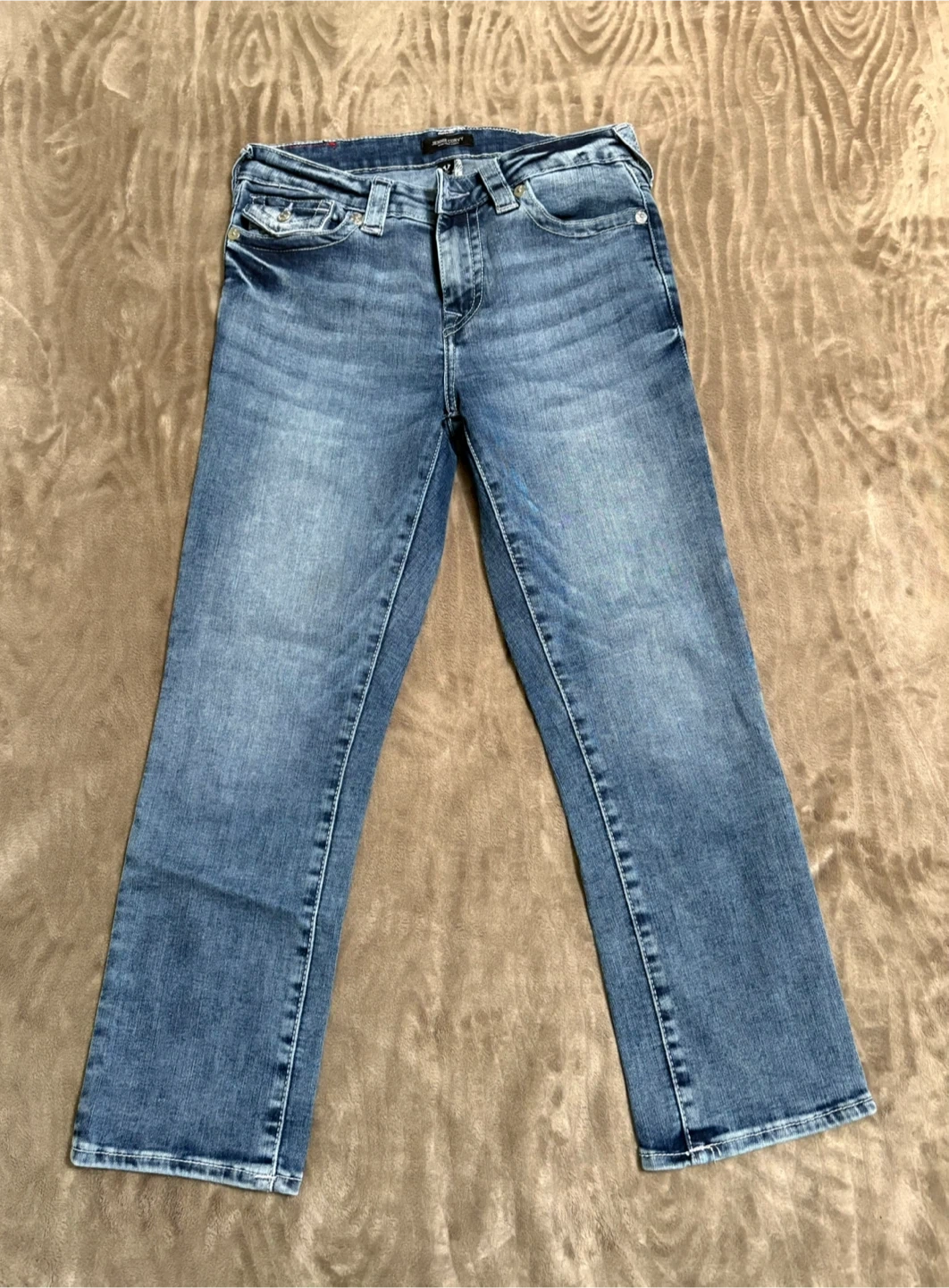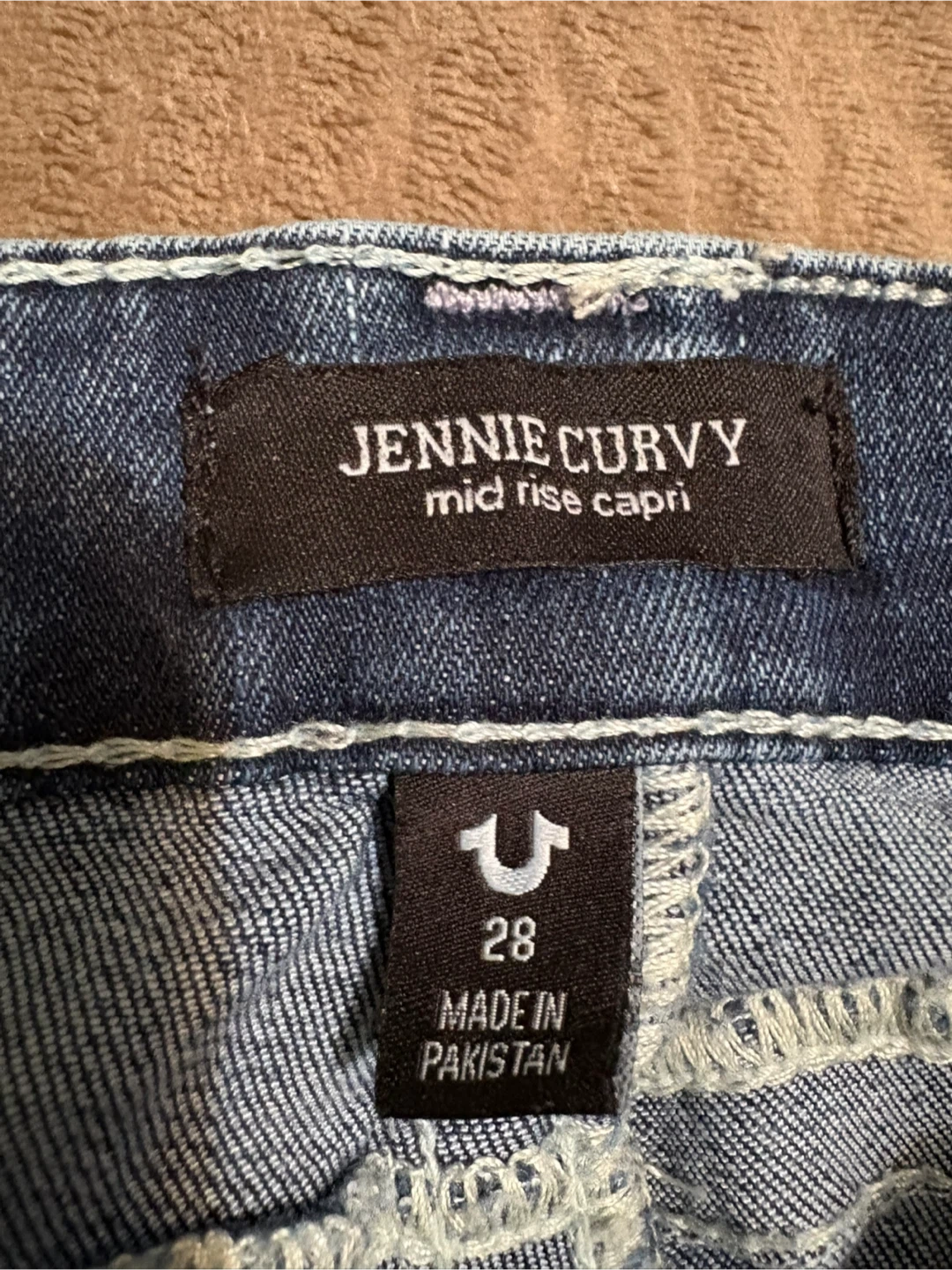 Blue denim capri jeans from True Religion. Jennie Curvy fit with a mid-rise waist. Made in Pakistan. Size 28.