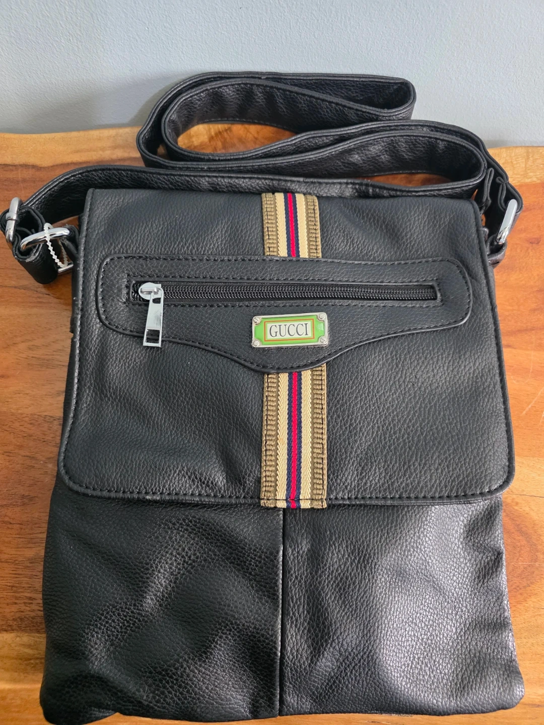 This black crossbody bag is made of faux leather and features a prominent Gucci logo plate. It has a zippered front pocket and a flap closure. The adjustable strap allows for comfortable wear.